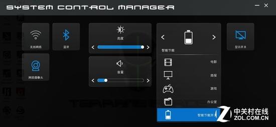 Syetem Control Manager是控制中心,有点类似于安卓的快速开关,能够实现一键开关WiFi、摄像头、蓝牙,还能控制亮度、音量,选择电池的使用模式等。
