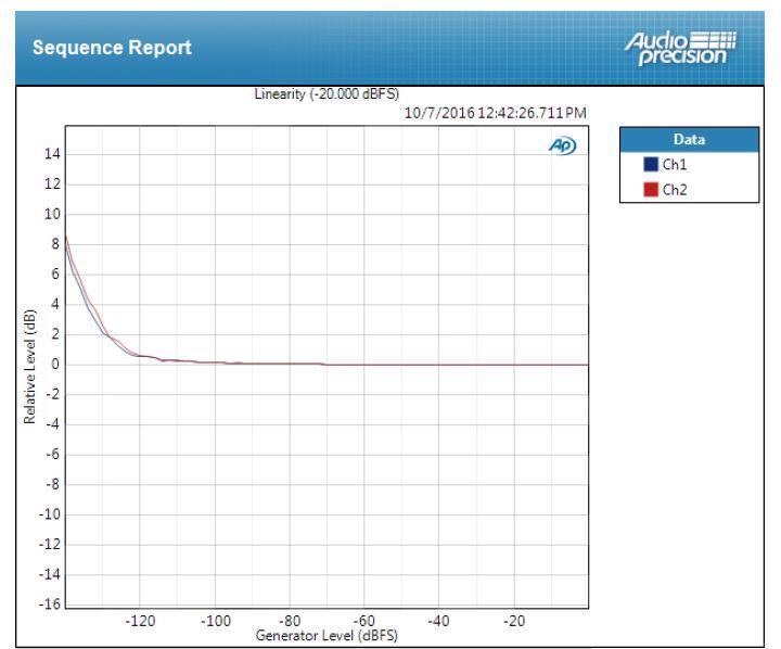 *众所周知,R2R型的DAC对于电阻的精度有着极为苛刻的要求。如果以CD的16bit精度来说,其最高有效位相当于32768个最低有效位,也就是说必须必须精度达到1/32768,也就是相当于0.003%。这对电阻的来说是一个基本无法完成的目标。而且这才是16bit,如果需要达到20bit,那精度的需要还要在此基础上提高16倍,如果需要达到24bit,则需要提高256倍。这使得R2R结构的解码器要达到高性能必须要通过特殊的技术。在著名的PCM1704芯片中,使用了激光修剪的方法,也就是说,对于已经制作好的电阻,测量其误差阻值后,用激光对电阻进行二次修剪,从而修正了其阻值误差,通过这个手段,PCM1704达到了当时R2R芯片的巅峰。而在“泉”的设计中,我们使用了动态补偿的技术。“泉”每个声道除了有一组主电阻网络之外,还有一组辅助电阻网络。辅助的电阻网络动态的变化阻值从而来修正主电阻网络的量化误差。举个例子,16bit的最高有效位的理想值应该是32768,但是由于现实中的误差,其值实际为32700。这时候辅助的电阻网络会产生68的值加入其中,最后得到32700+68=32768的理想值。动态补偿的算法非常复杂,其校准方法也非常复杂。但是通过这种方法才能够突破电阻精度的限制。否则,任凭你采用几百块钱一颗的金属箔电阻,也是无济于事。下图是“泉”的线性度实测图,可以看到其线性度非常优秀,比PCM1704K好10db以上,而对于其他未使用精度修正措施的分立式R2R设计则要好20-30db左右。