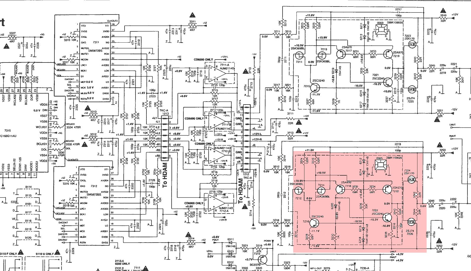 HDAM(Hyper Dynamic Amplifier Module),即高速离散放大器模块(或超动态放大器模块)。HDAM是马兰士自己研发的一种电路设计,可有效的提升音质。主要电路可参考下图(红框位置)
