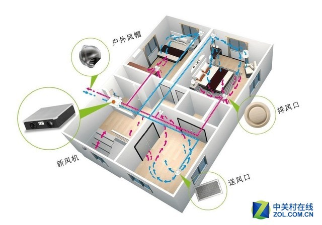 新风系统为室内引入新鲜空气呵护呼吸健康 与家用中央空调配套安装的新风系统则轻松解决了上述难题,搭载全热交换技术,通过内部的热交换器可以高效的回收热量,在消耗很少电能的情况下就能实现热量交换与传递,在将室外空气引进到室内的前提下并不会对屋里的温度造成太大影响,为密闭的室内空间注入室外富氧新鲜空气,实现了不开窗也能达到通风换气的目的。另外,新风机内一般均搭载过滤组件,对空气还能起到一定的净化效果,呵护呼吸健康。