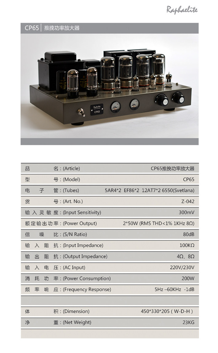 CP65是设计者最喜欢的一个机型,它专为号角音箱和古董音箱定制。音色如同外形怀旧温暖。强调耐听、细腻,功率输出流畅、饱满。希望把电子管独有的胆味全部发挥。 CP65在6年内根据用户反馈意见在一个平台下多次完善,提高可靠性和做工细节。这款升级版成熟可靠,经过多年市场沉淀。设计用时、器件选择都是不计代价的,目的只有一个--尽力做到完美。