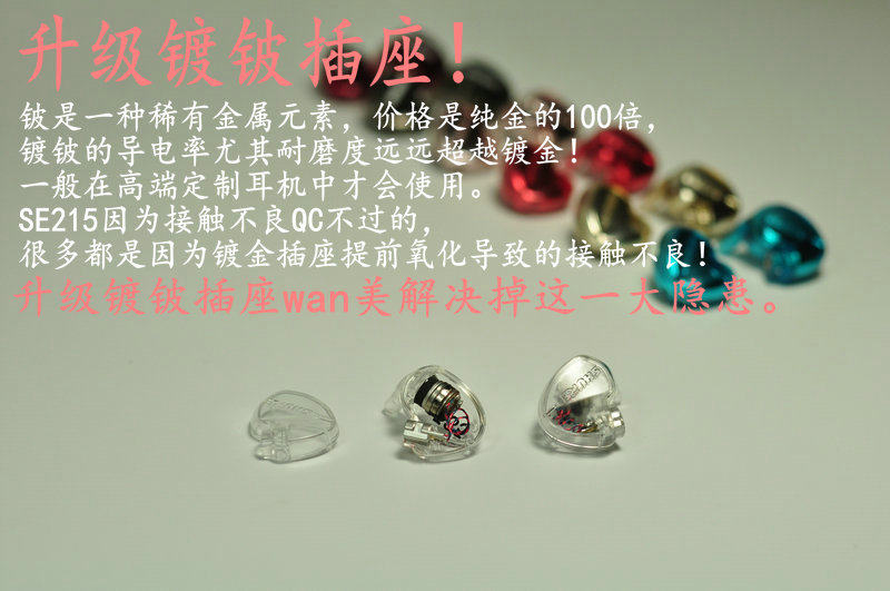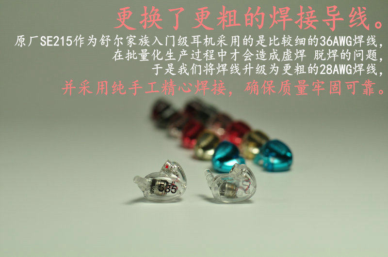 信得过也可以直接走微信,走微信包邮。微信 :12447619 (坛友特价,拍后报论坛字号让客服改价) 不温馨的拍前说明(其实是温馨的): 这批SE215是原厂QC不过检打下来的,我们工作室通过圈子内的关系托人拿了过来。经检测,基本上都是外观有瑕疵,连接线虚焊、脱焊,插座接触不良这类的问题,而耳机的核心部分发声单元都是完好的! 于是我们拆出原装发声单元,装入新的耳机壳体打造出了本款耳机。并且针对SE215容易出现的问题,我们做出了以下3个未雨绸缪的改进!作为一个专业的耳机工作室,我一直相信我们应该做的并不是简单的维修 改制这样的事情,融入自己的思想和对产品的优化改进也是必不可少的课题。 1、由于舒尔原厂封装质量很好,拆开后壳子都会留下伤痕,于是直接更换全新耳机壳!全新SE535壳采用600KG模具工艺,内外结构和原装SE535完全保持一致的同时,质量更加强悍,可以说踩都踩不坏! 2、更换了更粗的焊接导线。原厂SE215作为舒尔家族入门级耳机采用的是比较细的36AWG焊线,在批量化生产过程中才会造成虚焊 脱焊的问题,于是我们将焊线升级为更粗的28AWG焊线,并采用纯手工精心焊接,确保质量牢固可靠。 3、将镀金插座升级为镀铍插座!铍是一种稀有金属元素,价格是纯金的100倍,镀铍的导电率尤其耐磨度远远超越镀金!一般在高端定制耳机中才会使用。SE215因为接触不良QC不过的,很多都是因为镀金插座提前氧化导致的接触不良!升级镀铍插座wan美解决掉这一大隐患。 by 东渝 ————The END————