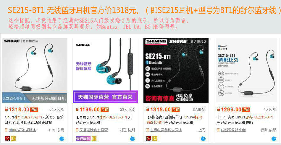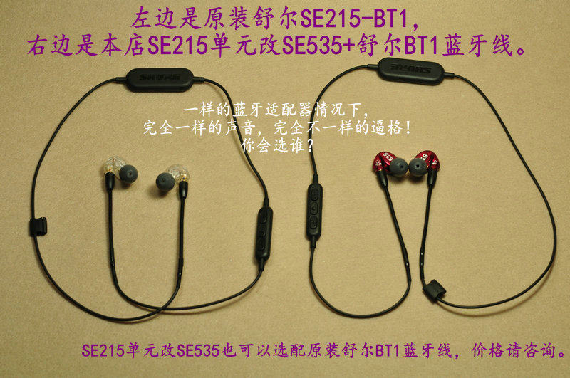 Shure/舒尔SE215单元,升级SE535外壳+蓝牙线! 微信/QQ(12447619) SE215BT1蓝牙耳机,官价1318元。本店所售为原装SE215单元换装SE535外壳,音质完全不变,外观逼格更高。 最有性价比的蓝牙耳机,没有之一! 坛友特价268/298元!对应原价298/348元,(透明/彩色)