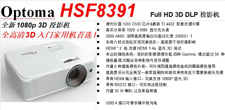 [投影机] 日本 奥图码 Optoma HSF8391 Full HD 3D DLP投影机全新行货 |