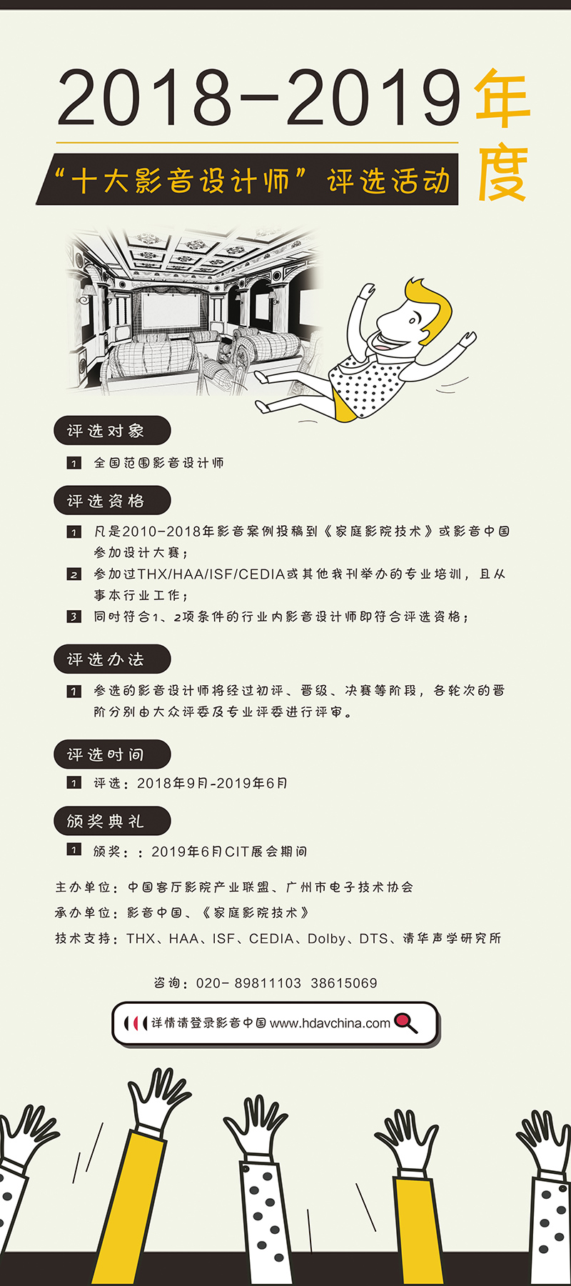 随着中国家庭影音娱乐市场的进一步成熟和规范,以营销为主的市场行为逐渐被摒弃,专业化、高水平、高要求成为了消费需求的主流。中高端消费群体对于影音娱乐的定制要求越来越严格,这也是影音市场专业化、高水平、高要求的重要体现。而既对接消费需求,又对接厂商产品,更要懂得完成案例设计实施的影音设计师,就成为影音市场非常重要的角色。 《家庭影院技术》杂志从2008年起,陆续引入美国THX、ISF、HAA、CEDIA以及国内清华声学等专业培训项目,促使国内影音设计师朝着标准化、技术化、专业化的方向转变,10年间共培养超过3000位影音认证工程师;《家庭影院技术》杂志和影音中国2010年发起的“我爱家庭影院”影音案例创意设计大赛,把国内优秀的影音案例进行了有效收集、整理和公布,让优秀的案例得到广泛传播,8年间收集发布超过1500个影音设计案例,进一步推动了国内中高端影音设计市场的高水平发展。 为了提高影音设计的技术水平,发掘优秀影音设计师,推动家庭影院娱乐市场正规化、专业化,促进产业健康有序发展。同时为了提升国内影音设师的设计能力和水平,鼓励影音设计师们提供更多高水准、接地气的影音案例,《家庭影院技术》杂志社/影音中国在举办2018-2019年“私人影院”创意设计大赛的基础上,同期组织策划首届“2018-2019年度中国十大影音设计师”的评选活动。  附:2018年度“十大影音设计师”评选相关细则拟邀请评委国际权威机构代表、资深影音专家、媒体或独立评论人,约20人。 评选对象全国范围影音设计师(需在2010-2018年内,有影音作品投稿到《家庭影院技术》或影音中国参加影音案例大赛;或在2018年内投稿的影音设计师,均视为符合资格评选对象且本人还在从事本行业工作)。 参评资格获取(必须同时满足1和3或2和3项要求)1、影音中国推荐 往年已经投稿参赛的设计师,由影音中国联系,为该设计师发一份《“十大影音设计师”参评表》。设计师填写表格,并回传给影音中国,即可视为获得参评资格。参评的作品以往年投稿作品为准。 2、自行投稿参评 往年未有投稿的影音设计师,需在2018年内至少提交一篇影音案例作品到影音中国。并填写《“十大影音设计师”参评表》,即可获得参评资格。由影音中国编辑人员联络该培训学员,投稿参加赛事及评选。 3、必备资格 所有参评的设计师,必须参加过《家庭影院技术》杂志/影音中国承办过的任何一期THX或ISF或CEDIA课程培训(不限次数与级别)。 评选办法1、报名阶段 时间:即日起至2019年1月1日 报名办法:经推荐或自主报名,成功填写《“十大影音设计师”参评表》,即视为获得参评资格。 名额:不限 2、公示与初选阶段 时间:2018年10月-2019年1月 公示办法:将符合参评资格的设计师在影音中国平台进行集中展示。 初选办法:由影音中国编辑根据参评设计师的稿件情况,进行初选。 具体初选标准和办法届时发布。 3、晋级阶段 时间:2019年1月-2019年5月1日 评选办法:在初选出来的50名参评设计师中,参加影音中国组织的“虚拟设计”项目考评。项目考评结果进行网络大众投票。 晋级名额:票数最高的20名,为晋级决赛名额。 具体晋级标准和办法届时发布。 4、决赛阶段 时间:2019年5月1日-2019年6月1日 评选办法: 晋级阶段票数最高的10名设计师,进入决赛的考评。 具体决赛评选标准和办法届时发布。 入选所获荣誉/奖金1、获得“十大影音设计师”的称号并获得10000元奖金+奖杯+证书; 2、晋级20强的影音设计师(第11-20名),获“优秀影音设计师”称号,获得证书及奖品。 3、获选的“十大影音设计师”将在影音中国网站及新媒体平台展示作品及有人物简介;推荐在THX/HAA和CEDIA、影音中国官网发布该荣誉和获奖个人信息。 4、获得“十大影音设计师”称号的设计师,其个人简介和优秀案例将刊登《家庭影院2018-2019年鉴》一刊内; 5、获得“十大影音设计师”的设计师将隆重亮相2019年6月在北京举行的“2018年度十大影音设计师”颁奖盛典,并安排现场发言。