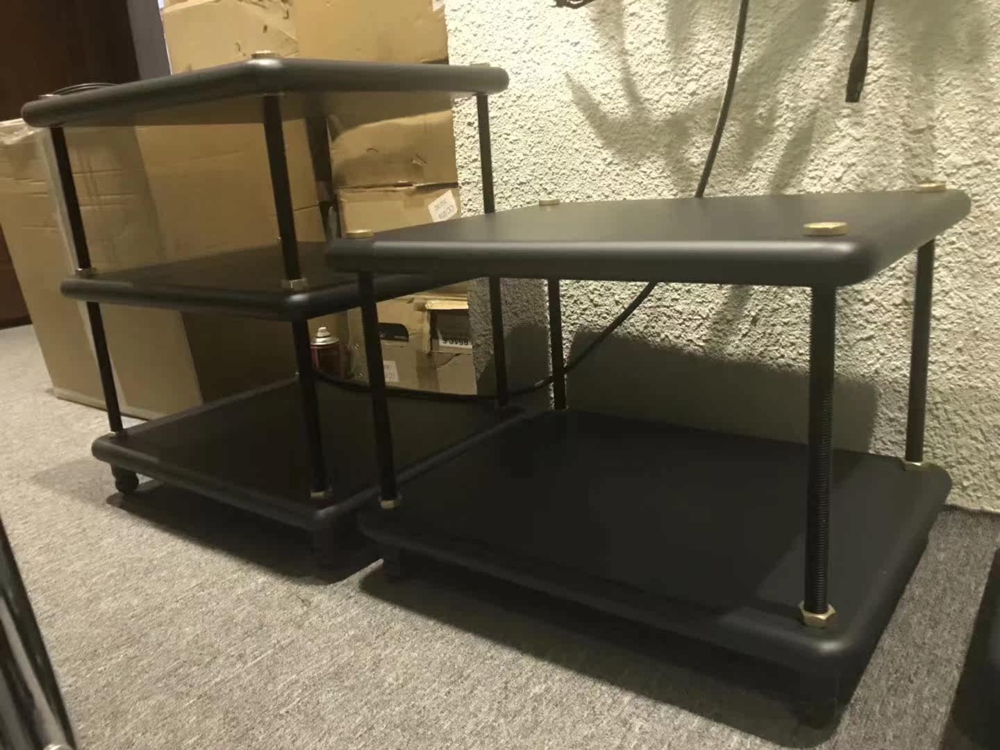 进口机架实木进口用料非常好,板的中间掺入调音碳纤颗粒,声音提升了贵气和细节,中高频细节更精巧细致,乐器场面定位更深远宁静,频段的延伸有非常明显的提高,这是属于美国公司迈克尔·格林公司独家精细15年生产,在全世界排名榜上也已经算疯迷全球的品牌之一。顶层的高度尺寸是固定的,其他高度可以调。板实际尺寸:(60cm宽×48cm深)板厚(4cm),重量:9KG. (1)单层机架 层板尺寸为:600*480*40mm(宽度*深度*板厚度),架子配套4根螺杆高度为4英寸即101.6mm,加上铜顶盖、铜脚钉、铜钉垫后整体高度为141.6mm。总重量为(10.82KG) 全套配备如下:SIGNATURE 顶板1块、铜顶盖4枚、铜脚钉4个、铜钉垫4枚、101.6mm英制螺杆4条、铜螺母8个。