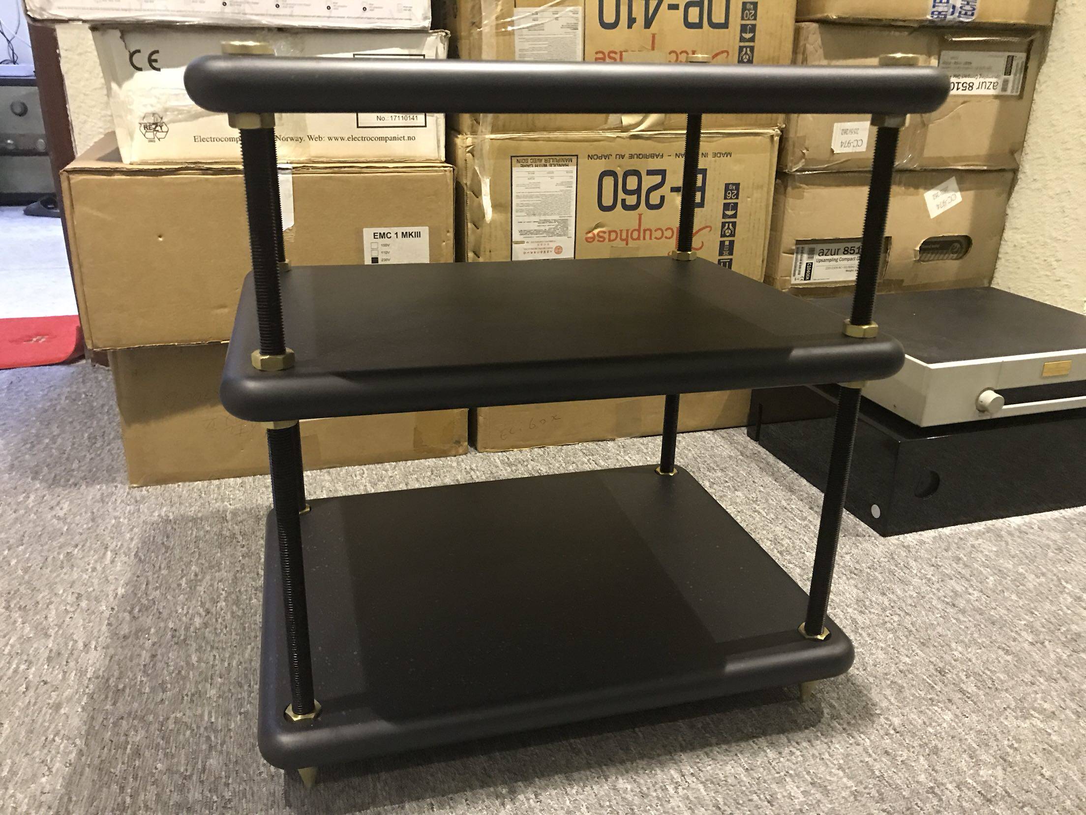 (3)三层机架 层板尺寸为:600*480*40mm(宽度*深度*板厚度),架子配套4根螺杆高度为24英寸即610mm,加上铜顶盖、铜脚钉、铜钉垫后整体高度为660mm。总重量为(33.5KG) 全套配备如下:SIGNATURE 顶板1块、层板2块、铜顶盖4枚、铜脚钉4个、铜钉垫4枚、610mm英制螺杆4条、铜螺母24个。 凡事购买本店老客户可额外订购相应的配套层板、龙床脚,螺丝柱、铜顶盖、铜螺母、铜钉脚、铜垫片等附件(不买本店购买的机架恕不单售附件),一切运费到付。