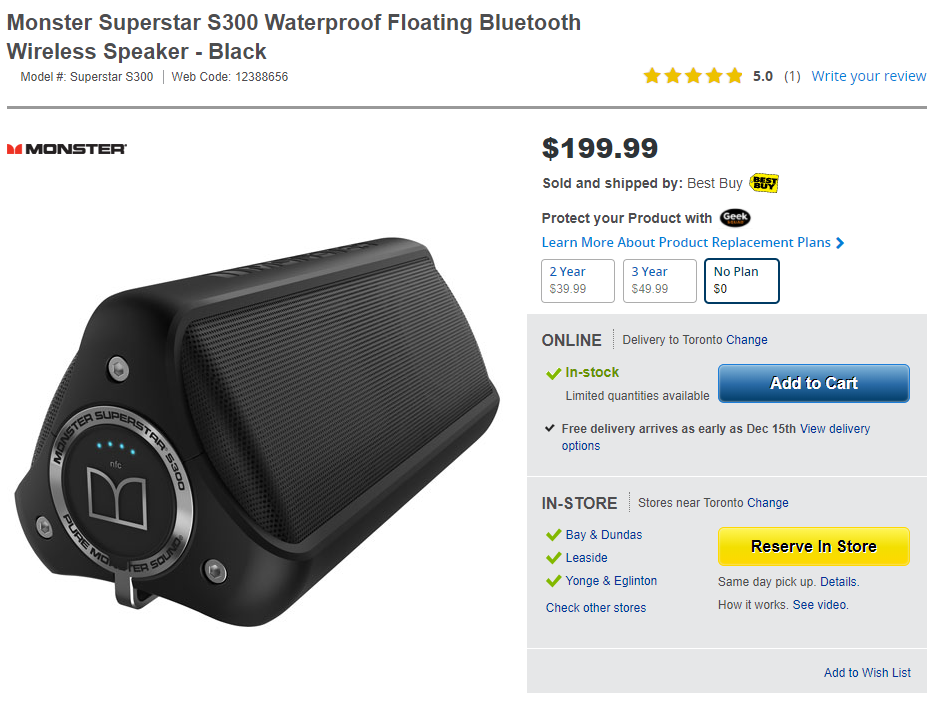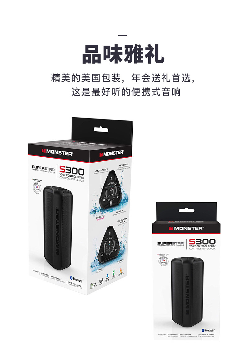 这款Monster S300是2018年最新款产品,在美国售价为199.99美元,未在中国上市,在美售价同为199美元的BOSE SOUNDLINK REVOLVE在中国售价则为1898元!