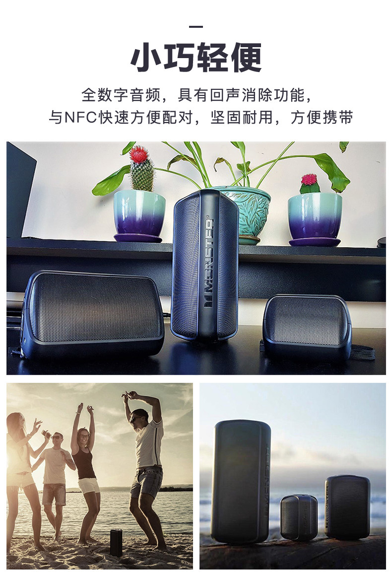 S300被评为IPX7,这是zui高的防水类别,这意味着您可以长时间完全浸没它在水中。但是,谁想听一个被淹没的扬声器!Monster S300能漂浮在水面上,所以如果你碰巧将扬声器放入水中,它不会下沉,会继续播放!这也意味着它完全适合户外使用,风雨无阻。