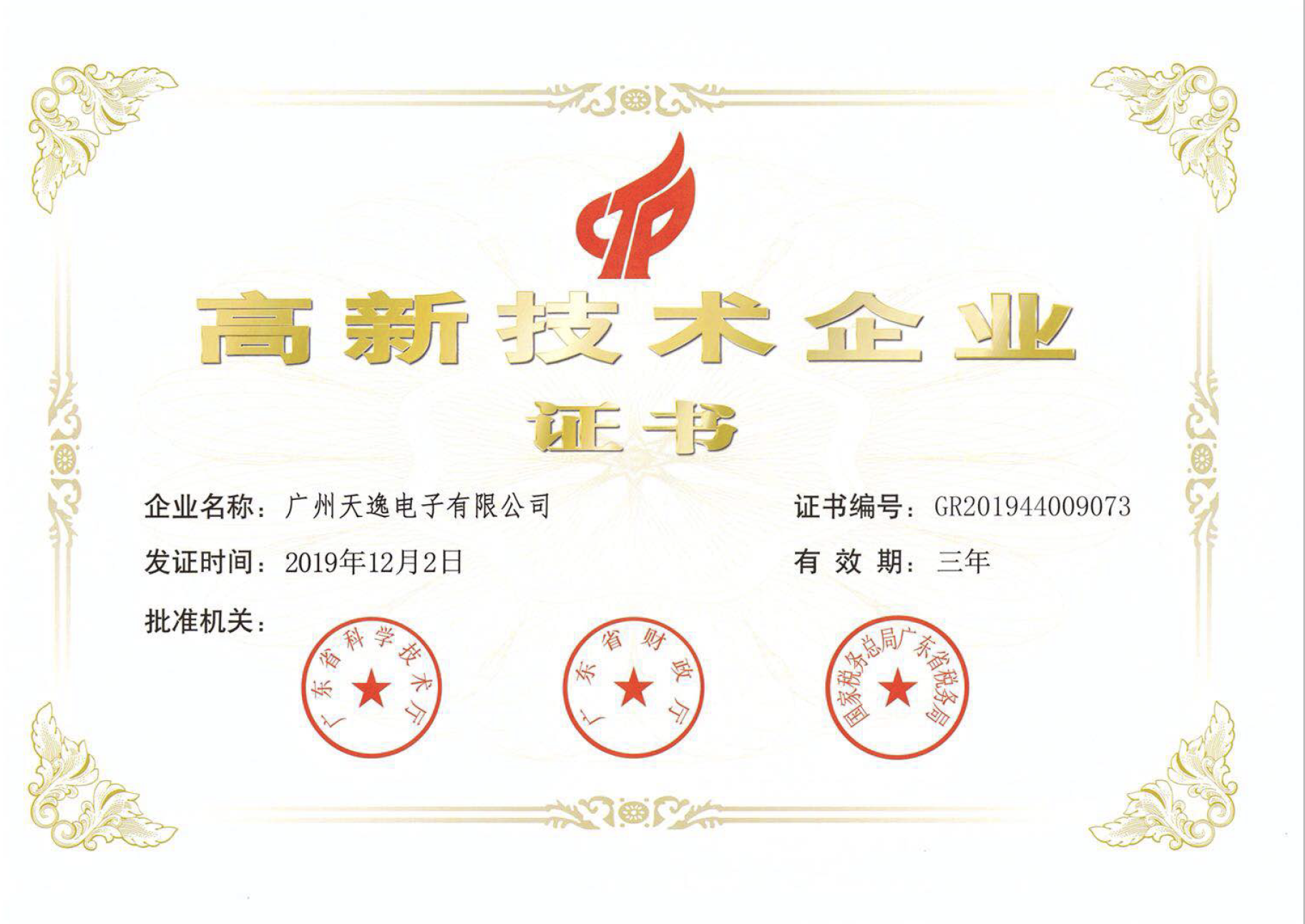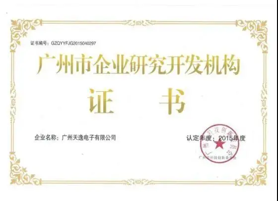 如今,天逸音响已获得多项国际专业权威认证、3D高清视频认证等,成为国内唯一一家同时获得美国DOLBY-ATMOS(全景声)、DTS:X(沉浸式音效)、HDMI2.0技术认证和授权的企业,并且早在2012年已成为我国高新技术企业、广州市企业研究开发机构。  高新技术企业证书