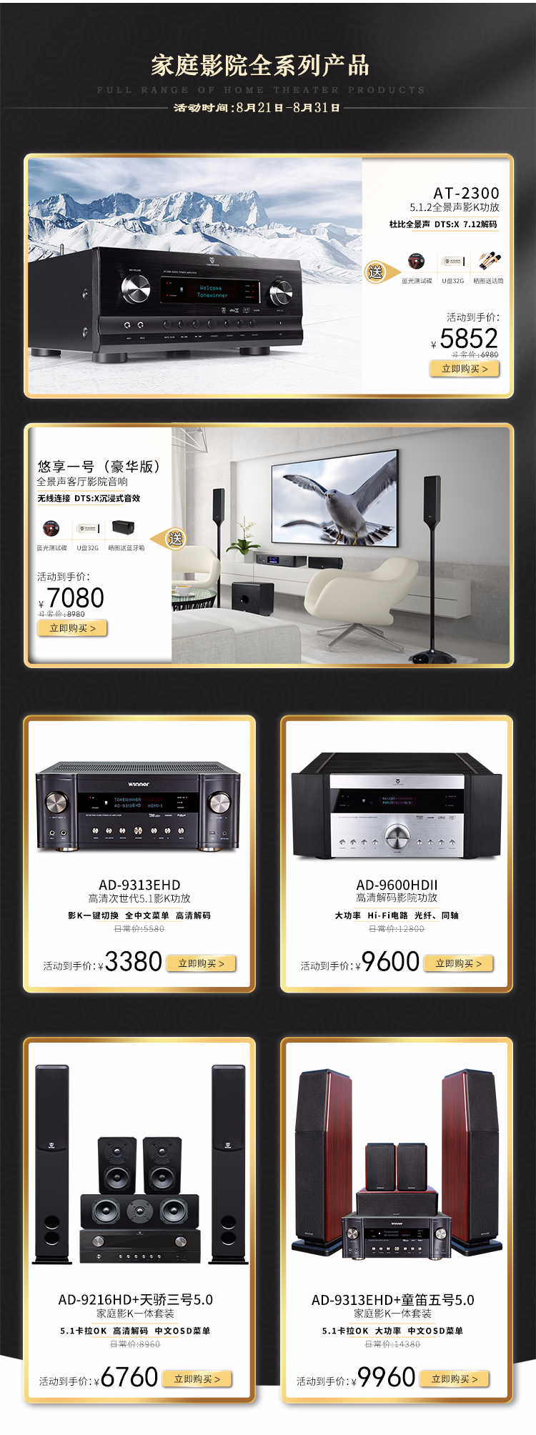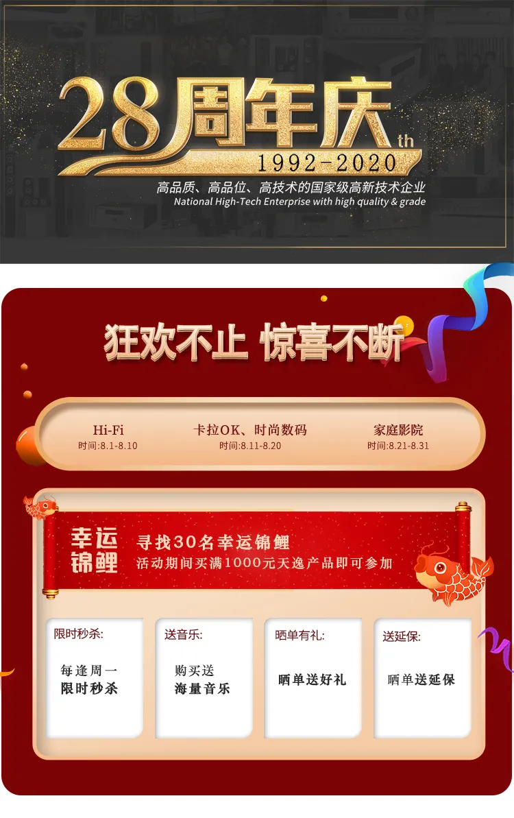 天逸音响已经成长为一家在国内极具影响力的高端音响品牌生产企业,无论产品、技术均与全球同步,领先于同行! 家庭影院专场限时热卖天逸在28周年庆期间,联合所有电商平台旗舰店及授权经销店,对天逸所有网络在售的产品分类别进行放价优惠的活动还在继续!!!8月21日——8月31日,天逸家庭影院产品全场优惠来袭,逢周一秒杀活动仍在进行,有需要的朋友千万不可错过!!! 偷偷告诉你,购买产品满1000元还可能被选中为幸运锦鲤~ ↓ ↓ ↓ ↓ ↓ ↓ 活动时间:8.21-8.31