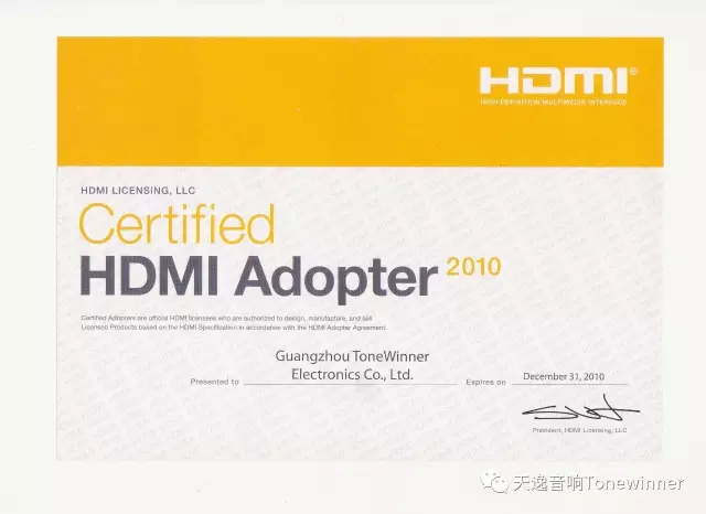 天逸长期与全球顶级的音视频高科技企业比如杜比、DTS、CRS、TI等有着紧密的合作,同时还和许多世界知名的音响品牌有合作,使公司的技术实力和设计开发生产水平始终与世界最先进的音视频技术保持同步,确保了自己在国内音响业界的技术领先的地位,是名副其实的中国著名音响品牌。  HDMI认证