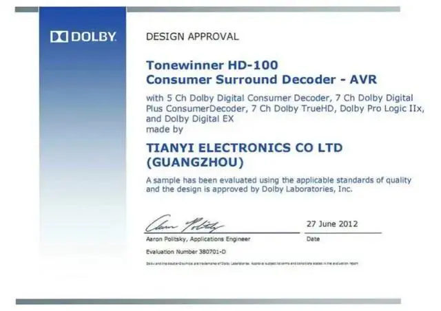 除此之外,天逸音响还聘请高级工程师进行产品研发,在研发室增设专业的消声室,用于测试所有喇叭单元。 AT-2300——创世代全景声影K功放就是凝结着数位顶级工程师的智慧与汗水,经过几百个日与夜的精心设计和严格测试而成。  杜比授权