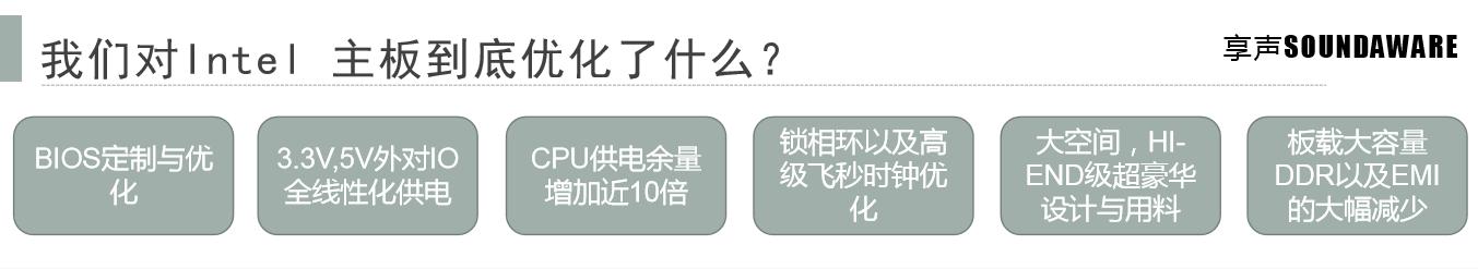 然而对三大品牌几千种在产主板的研究,发现多年前推出了ATX-12V标准后,绝大多数主板几乎并没有充分使用ATX 标准中的5V、3.3V为IO供电,这样导致最基础的IO线性化都无法实现。但是最后我们在ASROCK的不到10块主板中,发现有可能使用了ATX电源的原始供电,最终确认两块主板达到IO线性化的要求。然而,IO线性化只是基础,以自研标准来衡量,离AMC还有一定的差距,哪怕ATX供电采用极为豪华的Hi-END供电,主板部分都比较省费用的设计,仍然对USB输出的噪声以及芯片电源响应有着明显影响,例如锁相环的供电是基于3.3V降压而来,相关的滤波就比较一般,一些无用的芯片需要禁用,板级电源还需要加强等等,这些都不是成品的消费主板所能达到的。为此,享声因为intel主板合作方的身份以及自身OEM的大客户的帮忙积极沟通,最终艰难与ASROCK达成了协议:基于享声有Intel芯片的所有资料,同时HIFI量少所以主板优化由享声完成,ASROCK提供支持,ASROCK完全按照享声的要求重新开发BIOS,达到影音HIFI的标准。