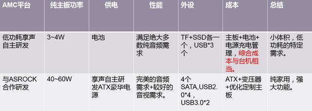 三年的All In的研发与深入优化,深知小众行业销量少、投入巨大的恶性循环的情况,三年时间才做成一个CPU主板,几乎投入了享声的全部研发资源。加上CPU主板的5年左右更新周期,随着APP的功能与性能要求提升,运行压力越来越大。虽然现在windows平台更新较慢,但是三年周期的研发,导致出来的平台可能只能满足音频类的需要,性能一般,长期以往必然恶性循环。所以享声自主AMC 平台,虽然台机功能仍然强大,但更多用于低功耗以及移动平台。以下为AMC 享声自研平台的信息: