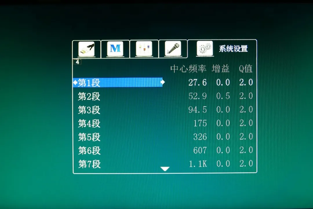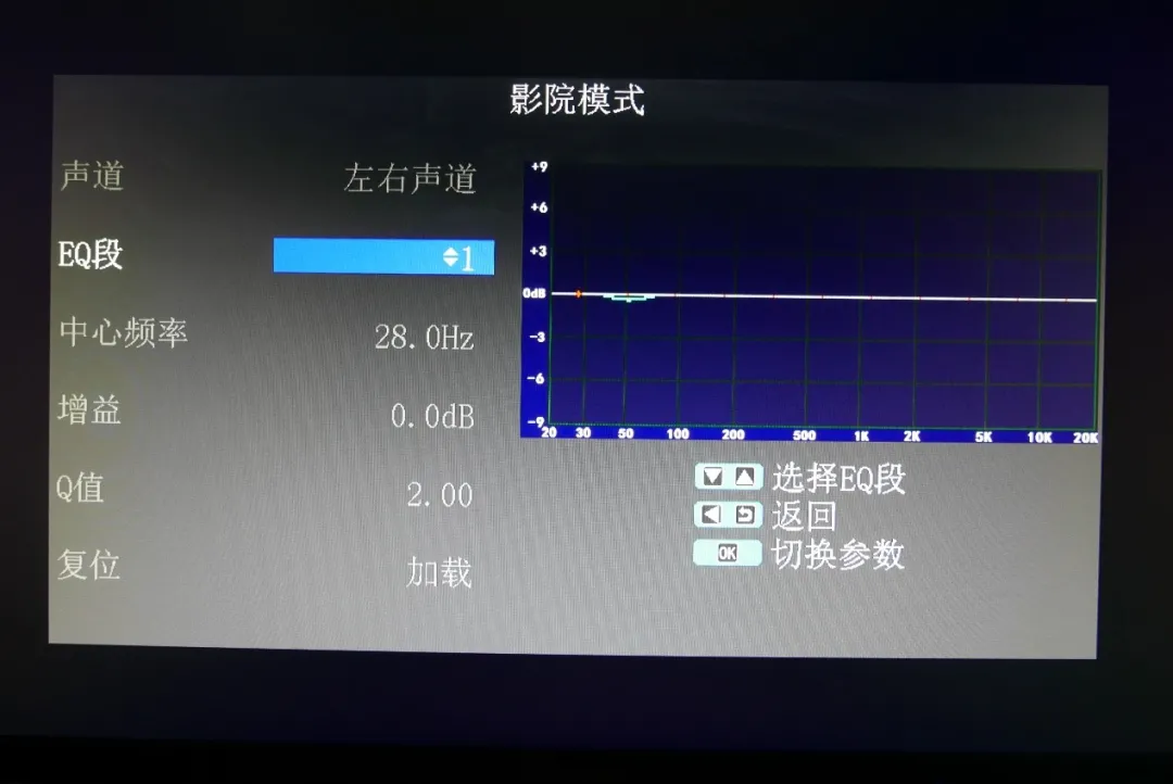 AT2300提供了四种EQ存储,默认出厂参数都为平值,你可以在测量生成的数据基础上,根据使用场景和个人喜好,手动调节参数并保存,在使用时直接调用。可调节参数有中心频率、增益和Q值,这里它提供了多段式调节,前三声道11段,其余9段,低音炮为5段。