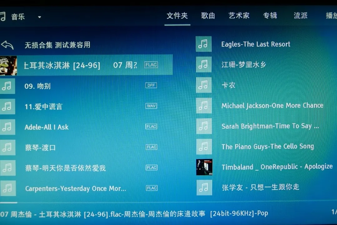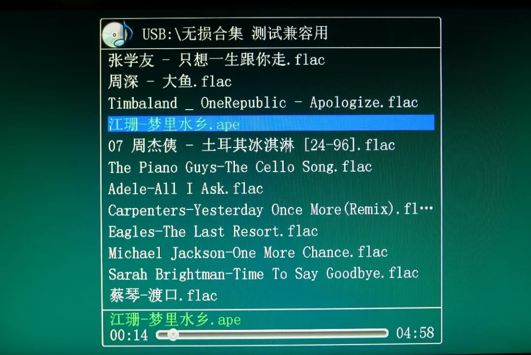 使用2300的内置音乐播放器,可以播放U盘里的高品质音乐文件,在机器背部提供了一个TF卡槽,你也可以通过插入存储卡播放音乐文件。对比在OPPO播放器上的U盘目录文件显示,可以看到它格式上仅支持FLAC、APE、WAV等PCM音乐文件,而不支持DSD和DTS多声道文件的播放。经过播放试听,音质上没有太大纰漏,可以满足一些音质要求不高的用户。