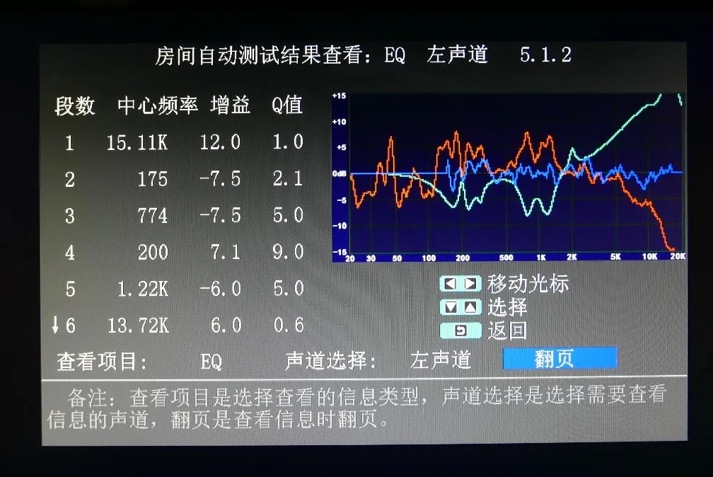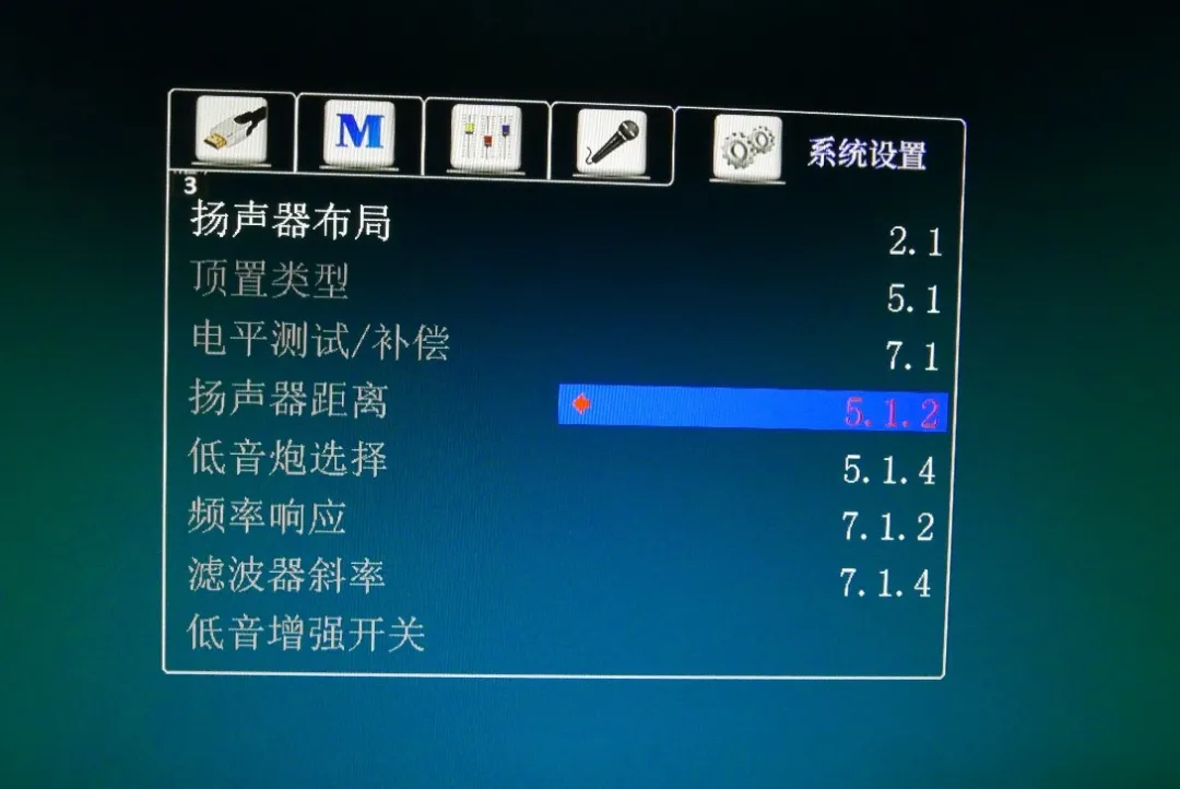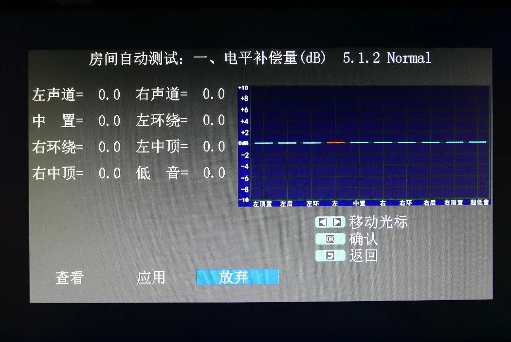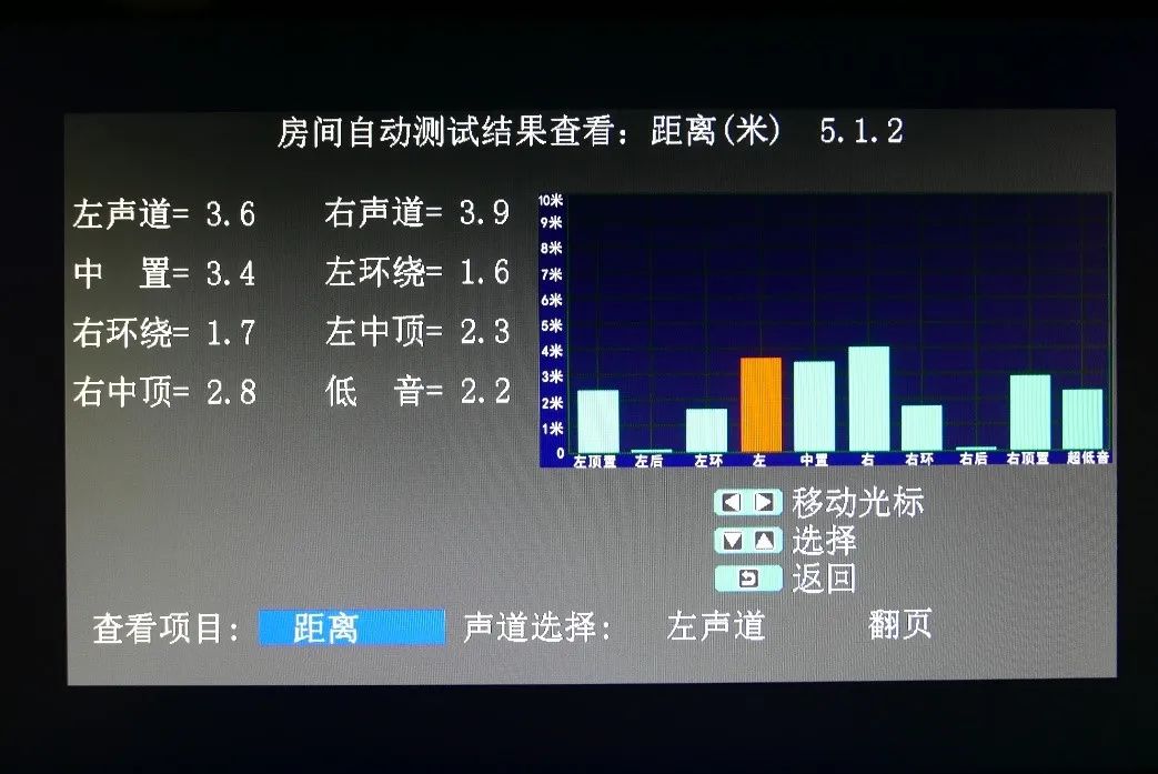 机器第一次开机后没有提供设置引导,这点上确实日系功放做的更人性化。按惯例还是先跑下房间测量,测量时最好先确认好下扬声器的布局,扬声器设置里提供从2.1到7.1.4的7种布局,其中全景声4种。这里我们采用的是5.1.2布局,具体搭配为5只宝仙娜P5作为地面,2只JBL Control one作天空,低音炮为宝仙娜P15A。厂家此次提供的他们生产的测试麦克风做工精良,并且连接线一端采用了更专业的平衡口,但这个麦克风并不是机器原配版本,需要单独购买。将测试麦连接到功放背部的接口,就可以开始测量了,虽然系统只给了一个测量点,但从测量完的数据来看,基本精准。测量完系统会对数据进行分析,并自动设置电平补偿以及EQ调节等参数。即便你使用自动EQ时,也可以适当手动更改这些参数。比如扬声器分频点:主音箱可以设置到90HZ、卫星箱设置120、低音炮下限可设置为无限制、上限数值要高于主音箱分频点比如150。而各声道电平参数尽量维持在±5之间,至于距离参数则是声道到达皇帝位的延迟,不建议手动去更改。