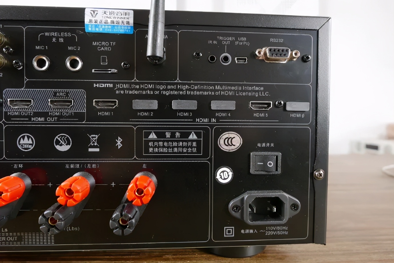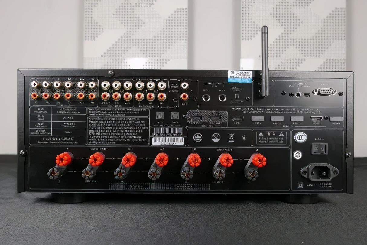 我之前吐槽过日系功放后部冗杂的模拟视频接口是鸡肋,国内几乎没人会用,而此次天逸AT 2300的接口设计则清爽许多。视频部分上淘汰掉了众多模拟视频接口,配备了6进2出的HDMI 2.0(其中一组支持ARC)数字视频接口。音频部分设有3组模拟输入、两个同轴和两个光纤口。值得注意的是它后部增加了一组5.1的卡拉OK输入,和两个无线麦克风插孔,方便重度K歌用户使用。声道上为5.1.2输出7.1.4解码,当然也可以通过外接功放实现7.1.4。扬声器接线柱采用斜角排列,间隙也足够大,为接线时增加了便利。