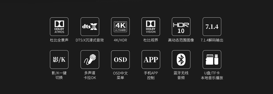 3. 支持HDMI2.0,支持HDCP2.2; 4.支持4K/60Hz,RGB 4:4:4,18GHz全带宽高清视频信号; 5.支持Dolby Vision及HDR 10高清视频信号; 6.多达 13声道的全景声7.1.4音频解码线路输出; 7.首创行业专业级5.1.2声道沉浸式卡拉OK效果,强大的DSP数字混响效果及九级防啸叫移频处理技术,多种人声风格选择; 8.房间EQ、扬声器距离、延时、声压的自动测试及补偿,一键式操作,全自动校正,同时支持用户手动调节; 9.内置蓝牙数字音频接收器; 10.内置高品质音乐播放器,支持TF卡及U盘音频文件播放,支持FLAC、APE、WAV、MP3等多种无损及有损压缩音频格式,支持多层文件夹管理; 11.支持手机APP操作; 12.全中文叠加式OSD屏幕显示菜单; 13.支持本地音乐信息手机及电视可同步读取显示; 14.支持从2.0声道到7.1.4声道等10多种扬声器配置; 15.支持HDMI 6进2出,2组同轴2组光纤数码音频输出,3组模拟音频输入;