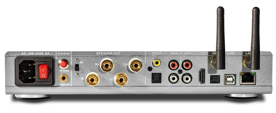 就功能来说,Omnia A300 确实功能丰富。它本身就是一台综合扩大机,数位输入方面有以太网路的 RJ45 与 USB type B 可供串流,以 HDMI 为介面的 I2S 输入可连接 NuPrime 自家的转盘,至于传统的光纤输入也没少给。此外,还准备了一组 RCA 类比输入,让你可以连接既有的讯源。