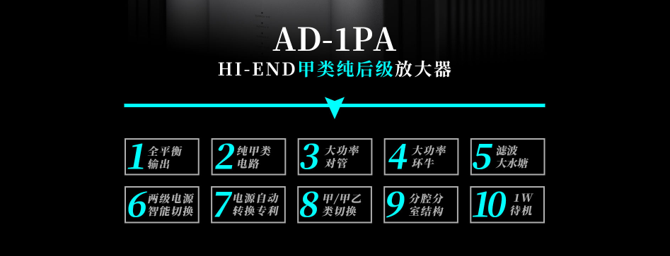 AD-1PA的放大电路设计采用了音响界最为推崇的全平衡传输及放大方式,为达林顿差分BTL桥接输出,是彻头彻尾完全平衡的传输放大方式,即:全对称、全平衡、差分输入到BTL(桥接)功率输出。每声道由一对中功率管推动8对150W的东芝TTA1943/TTC5200大功率管担任,全机使用了32只,提供2×300W/8Ω的充沛功率输出!