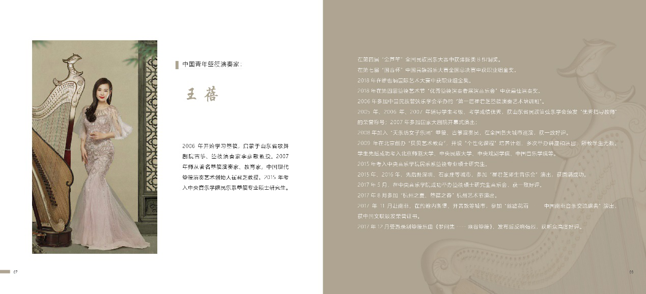 担任《舫的故事》这张唱片的主奏的,是新一代箜篌演奏家王蓓,她毕业于中央音乐学院,师从于我国箜篌演奏“第一人”,著名箜篌演奏家崔君芝女士。王蓓是第七届“国音杯”中国民族器乐大赛全国总决赛职业组金奖,也是“维也纳国际艺术大赛”职业组金奖。