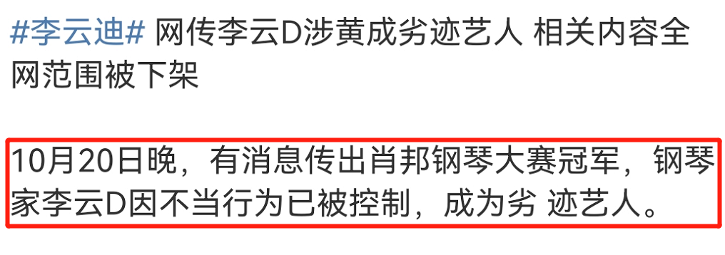 有人表示,可能是因为10月20号晚上网上传出消息:李云迪因不当行为违法被控制,成为劣迹艺人。