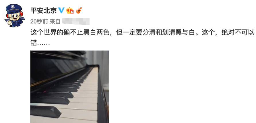然而,李云迪和节目组这边还没动静,“平安北京”却在晚上发文称:“这个世界的确不止黑白两色,但一定要分清和划清黑与白。这个,绝对不可以错……”