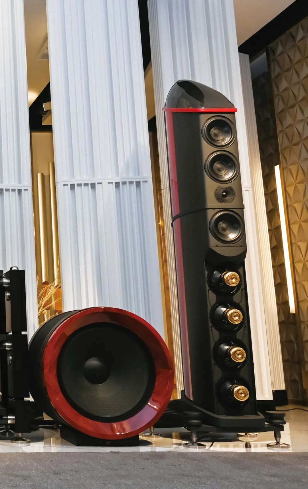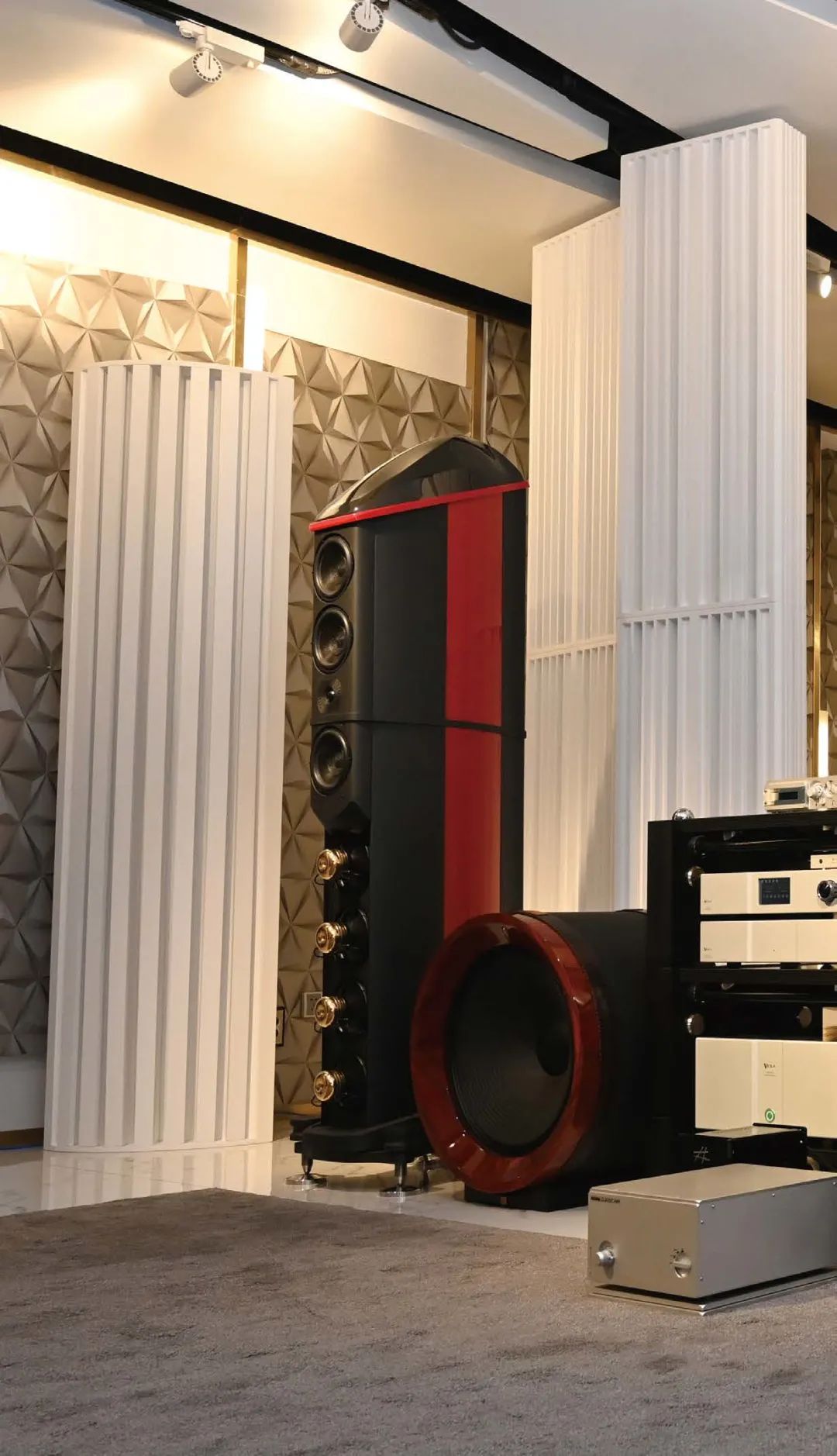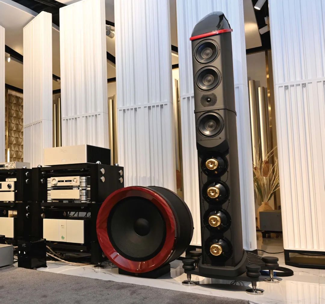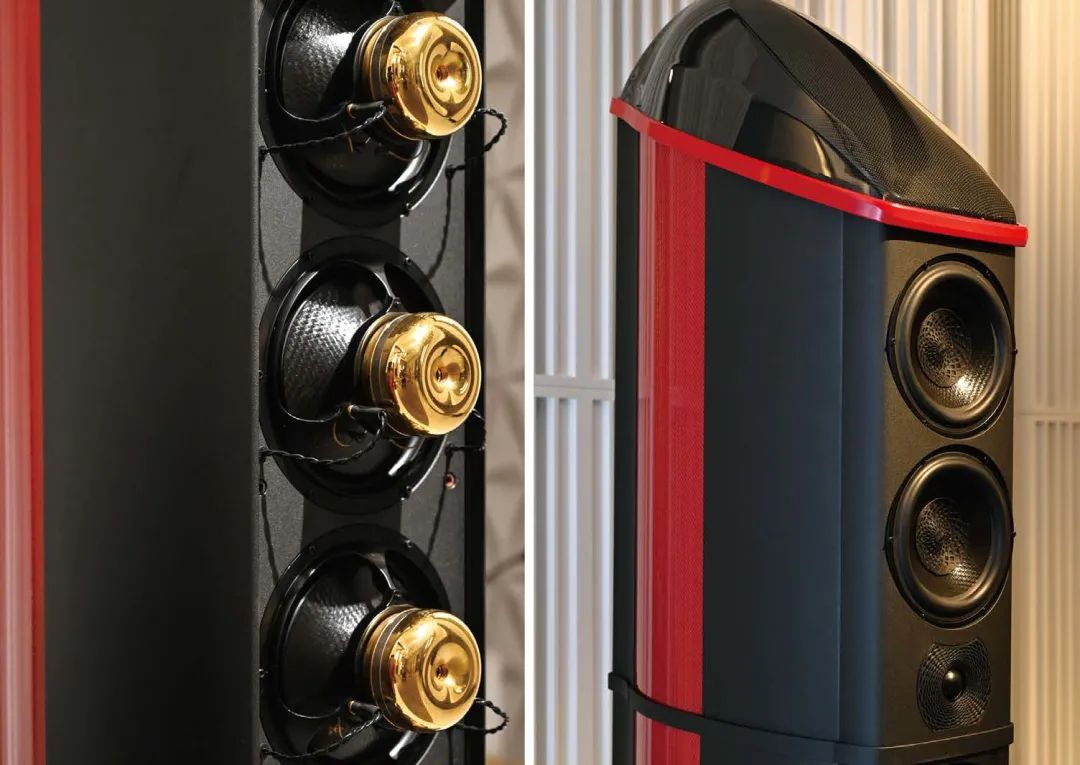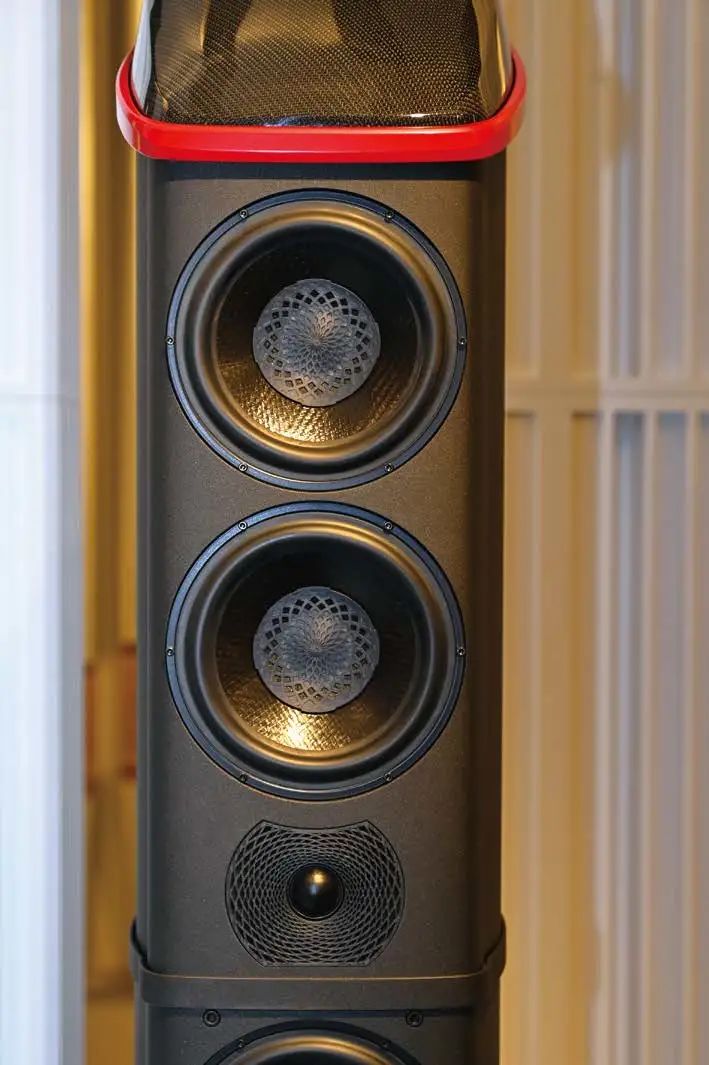 而坚持分频设计越简单越好的金驰厂方来说,喇叭单元的分频设计极其简单,避免复杂的电路消耗功放的功率,降低相位失真,但越简单的分频对喇叭单元素质的要求也越高!使用第三代TacticIII技术的金驰喇叭单元,特别是高音单元,金驰在振膜背面设计了碳纤支架,软球顶混合了碳纤丝的编织方式,这软膜高音中部硬周边软,且从软逐渐过渡到硬,越靠近振膜中心越硬,频率也越高,既有软膜高音的润泽和厚度,也有轻质硬膜高音的瞬态和质感和细节。手按住软高音振膜再放开它会迅速的恢复原状。在丝膜中加入特制的丝状碳纤材料,优化了刚度和阻尼特性之间的平衡,实现极为宽广的高频响应使高音单元无论从性能及质感都可以与中低音完美融合。特殊的2.5分频设计,高音单元金驰这只不经过分频器直通的7吋Tactic III中音单元频响非常宽阔,100Hz-10kHz维持-2dB的平直响应,靠单元本身的特性与音箱构造达到分频的目的。换句话说,金驰的中音单元是直通全音域单元,低音单元向上的延伸依然要切掉,但是中音单元向下的延伸不切断,让中低单元往下自然的延伸到下限。金驰的MTM单元排列方式,我们从外部看到“教皇”露出四只金灿灿磁钢以及盆架和接线的低音单元,其实箱体内部还有两只,和最底下的两只低音单元做面对面的等压驱动,加上上部的三只黑色碳纤复合盆中低音单元、一只高音单元,“教皇”总共有十只单元,别看教皇低音单元口径仅仅是7寸,Tactic III技术的运用、过硬的喇叭素质加上刚度与阻尼特性非常优异的箱体设计,频率响应达到令人惊讶的24Hz-30kHz(±2db)!