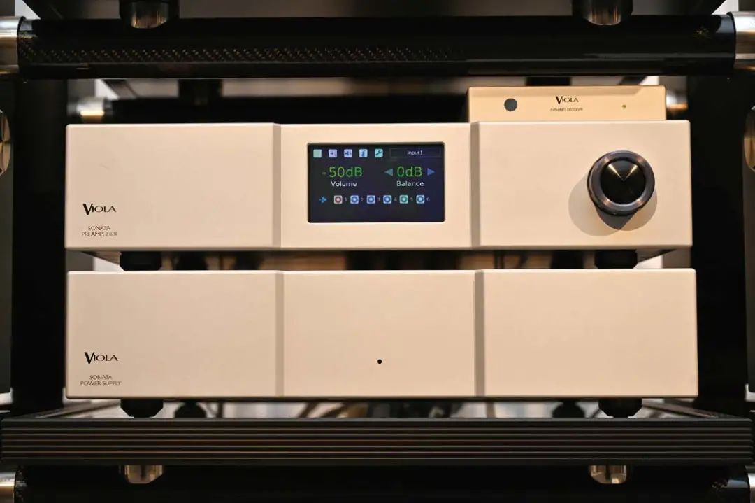 美国VIOLA前后级放大器正是我们前不久听到伺候金驰更小的型号Resolution音箱使用的那套:VIOLA电源分体的Sonata前级与VIOLA Cadence后级放大器(每声道输出功率200瓦/8欧负载,可桥接成800瓦单声道),只是上次用的只是一台后级,这次用了两台,但并没有桥接成当单身道,只是每一台后级只使用了一声道的输出,这样双功放玩法的好处的功放电源的供应更加充裕输出控制力更好。VIOLA这个品牌也许不少发烧友会觉得陌生,它跟Mark Levinson(马克.莱文森)以及Cello(车佬)有着直接的血缘关系,因为老板兼设计师Tom与设计团队主要成员Pau曾经就是Mark Levinson与Cello最主要的设计团队核心和重要功臣,让音质始终如一,实现材料和音质的均衡是VIOLA的理念和目标,虽然成立仅二十年,但成立初始就有超过三十年世界一线Hi-End品牌音响的设计功力积累,非常的不简单!倾力于重现声音的精准度同时保留丰富的音乐情感,这两个标准可以说是VIOLA主创人Tom与Paul职业生涯的代名词。