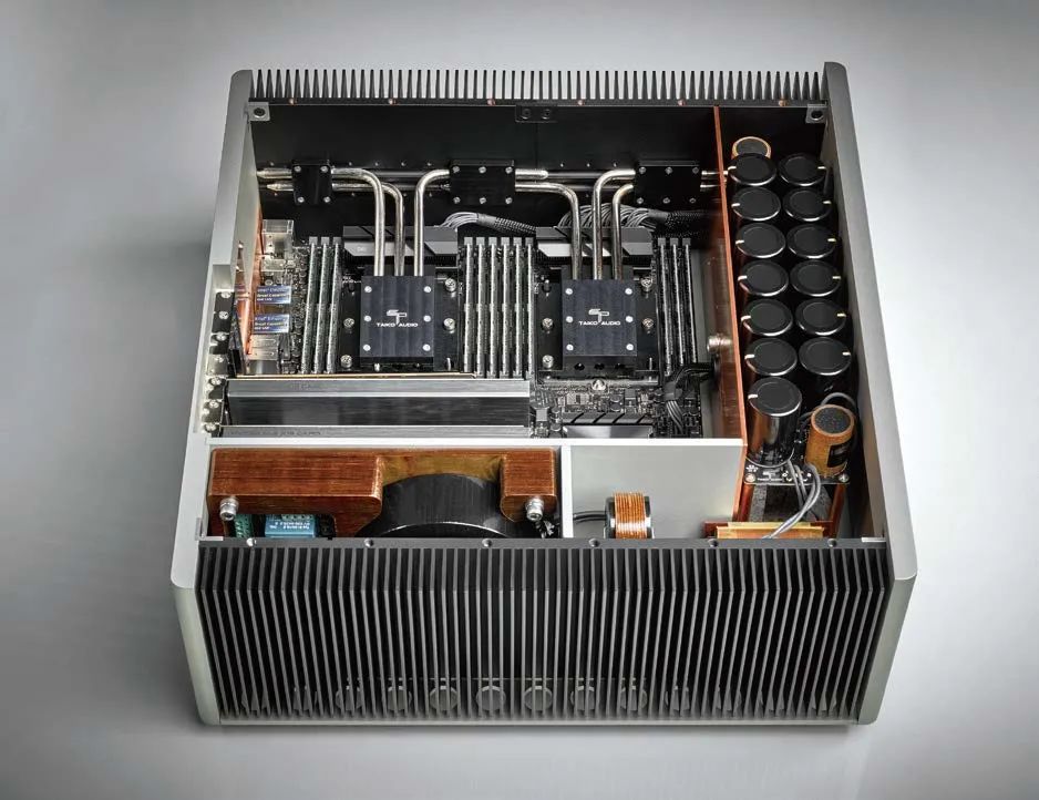同时它还是目前世界上唯一一台双“引擎”音乐服务器,这两组“引擎”是Intel专为企业级服务器而设计的Xeon Scalable CPU,有别于市场上其他音乐服务器架构。它的每一枚CPU,分别连接12组4GB内存,代表两组CPU架构下各自拥有48GB专门为Taiko Audio特别定制且严格配对的内存。一组“引擎”负责运行一个经过大幅修改、切合音乐播放所需的企业版Windows10系统;另一组“引擎”专门负责音乐播放相关的运算,互不干扰。为了确保未来很长时间SGM Extreme依然可以在顶级音乐服务器占据一席之地,更为了用户拥有长期的使用寿命,SGM Extreme采用灵活的模块化设计,加入足够数量的特制卡槽为了用户未来升级做准备,最多支持20核40线程,预置280GB英特尔Optane系统盘与最多支持24TB的音频存储扩展。SGM Extreme机箱背板设计同样是贯彻厂家Hi-End设计理念的模组式和插卡式设计,方便用户升级更加易于增添。CNC加工的超厚铜/铝/Panzerholz防弹木阻尼特性极佳、抗震能力超强的混合材料的重量级底盘除了抵消箱体轻微的谐震,同时彻底隔离外界震动。纯铜散热器由CNC车床铣制,配合超厚的铝制顶板和背板,机器重达42kg,既可抵御谐震,顶板与底板一共6000个圆形小孔是SGM Extreme的被动式散热器,无需风扇散热。圆孔的排列都是经特别电脑仿真设计, 既是散热孔还可用来滤除外界EMI/RF干扰。这是一台从系统设计、底层优化到电源设计、机箱设计都极HI-END音乐服务器,非常纯粹的数字转盘,并无任何DAC解码线路,就是为了在从存储的音乐文件和来自Qobaz和Tidaly以及Roon的流媒体音乐中提供最真实的声音效果。