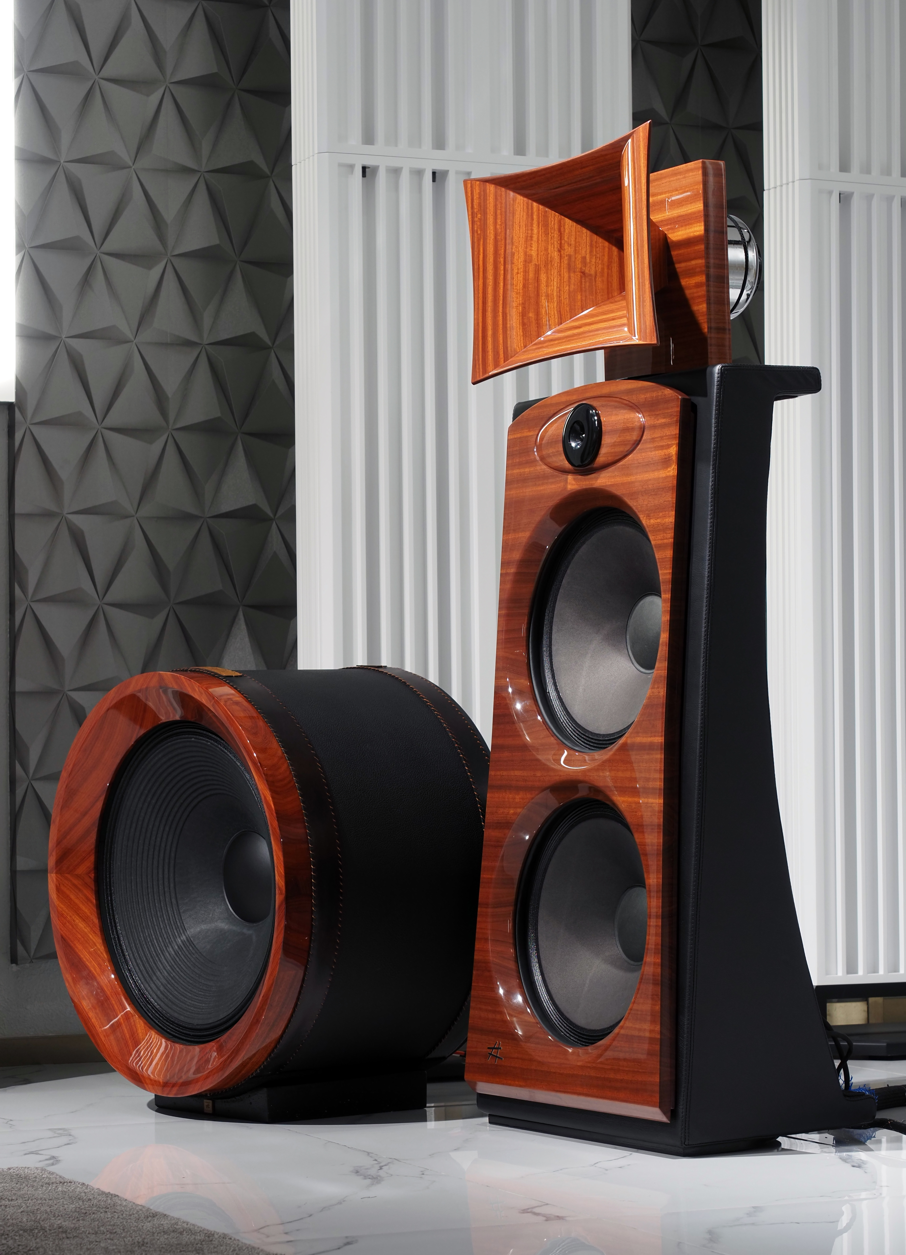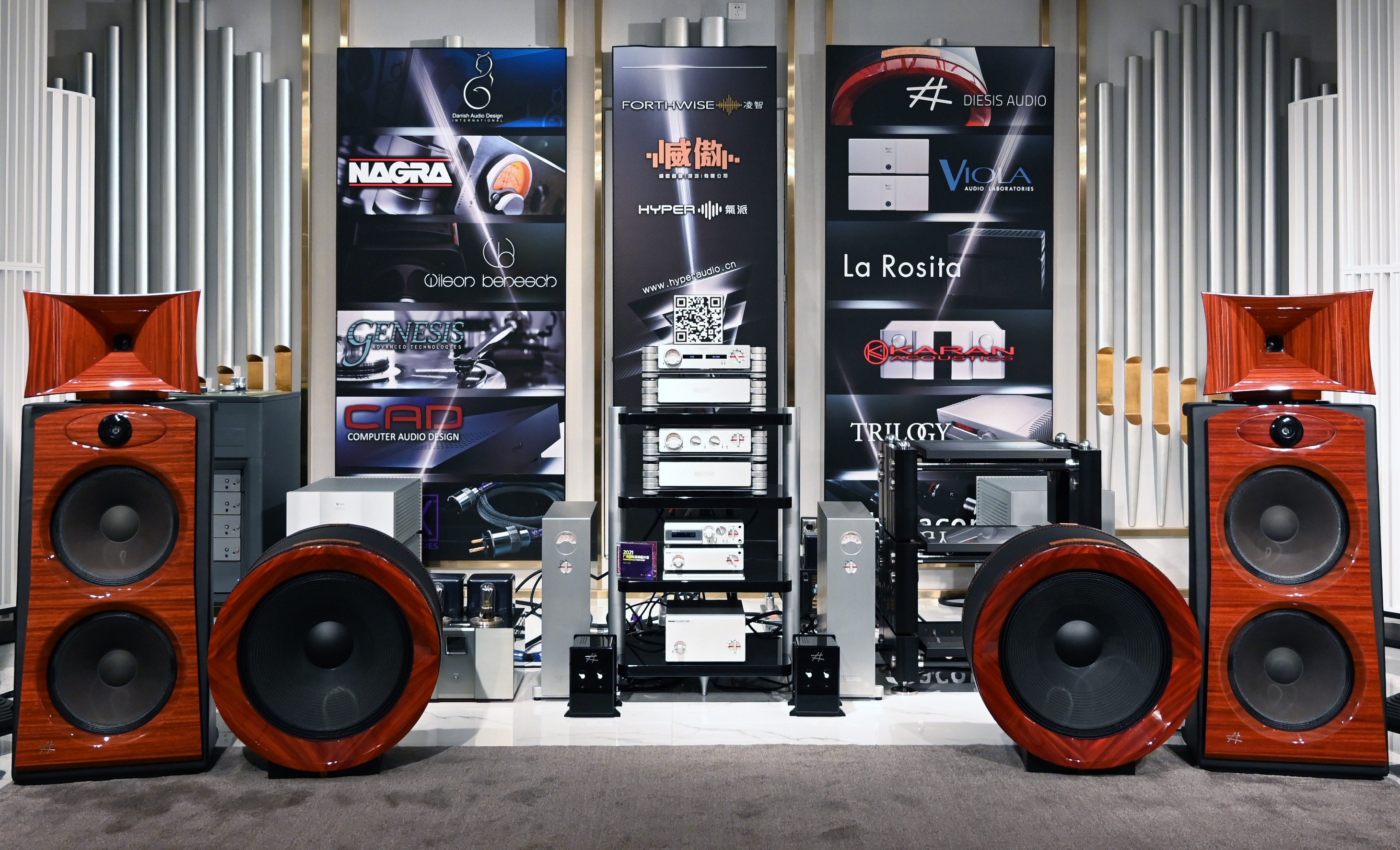 首创的偶极型低音发声单元与中音高音号角压缩单元融合为一体 Diesis Audio旗下的扬声器以号角为主,它们的特点是将偶极型低音发声单元与中音高音号角压缩单元融合为一体,即是单元既向前方又向后方辐射声波,而向后发声的声波则被抵消,从而令正向发声的声音更为干净。而且与我们所认识的大口径号角不同,它们的设计非常家居环境,简直是一件美轮美奂的艺术品。除了号角扬声器外,Diesis Audio旗下还有前卫的数字播放器和胆石混合的放大器,也就是说,Diesis Audio自家品牌的产品即可搭配出一套顶级的号角系统。其实除此之外,Diesis Audio旗下还有一件产品虽很少提及,但我也在广州见过,那就是Bonham Tribute擂动天使,它是专门设计用于立体声系统的超低音,而并非很多人所认知的“AV炮”或者“低音炮”。