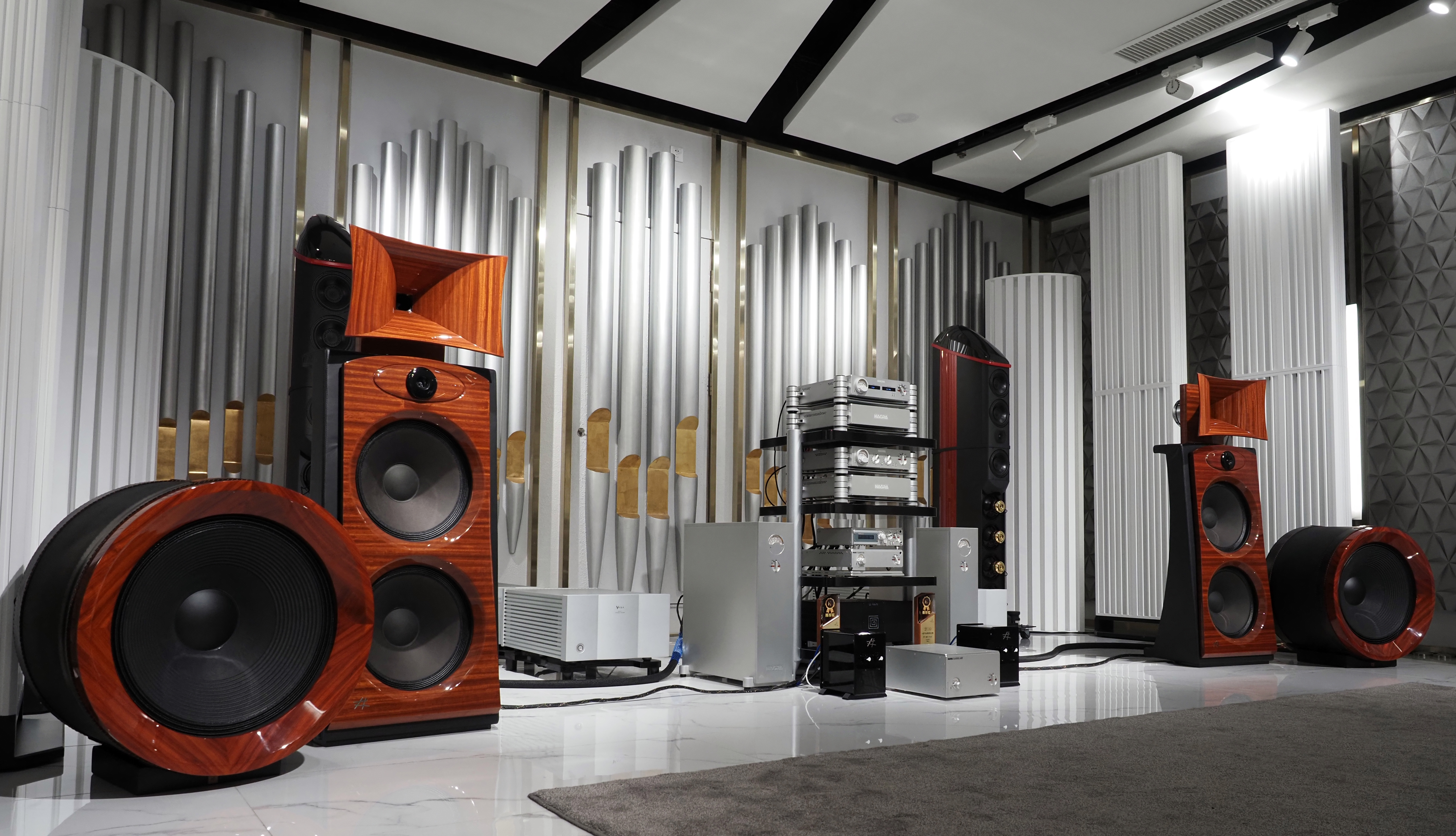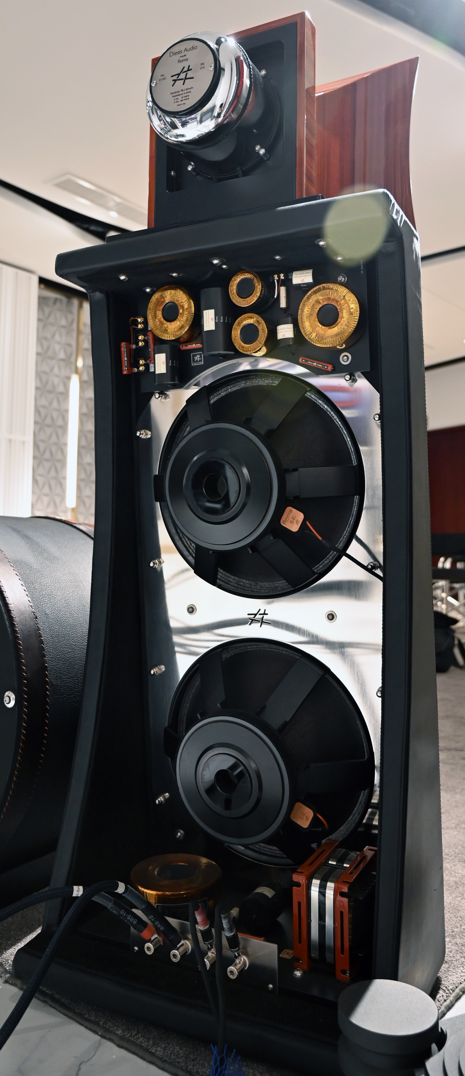 罕见的“同心压缩“驱动器单号角设计 Roma SE(罗马天使),可以说我们《新音响》杂志地域优势在其入驻威傲演示厅的时候我们就第一时间欣赏过。初次见到“她”就被其优雅精致的外观设计所吸引!绕到障板后面看赏心悦目,单看到外露的包括Audin 和 Mundorf豪华分频元件就令人垂涎不已!Roma SE是5路分音设计,顶上一只的扁长方形号角,外观上看像一只发声单元,其实它是同轴中高音设计,使用2寸+1寸同轴号角,号角底下是一只16mm超高音单元,最底下是两只15寸偶极型特制低音单元,灵敏度高达到98.5dB, 频率响应30Hz-38000Hz(+/- 3dB)!