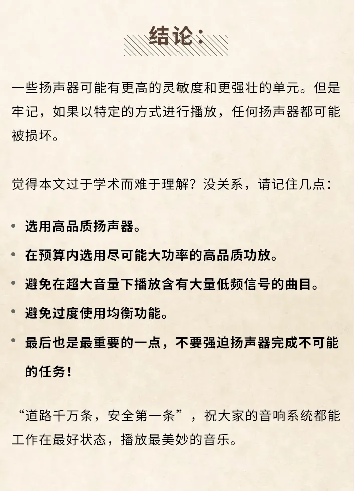 您可能听说过功率太小会更快更容易的烧毁高音单元,这并不完全确切。通常,当扬声器损坏时,原因是大功率播放持续时间过长,或者使用超大音量播放即使很短的时间。