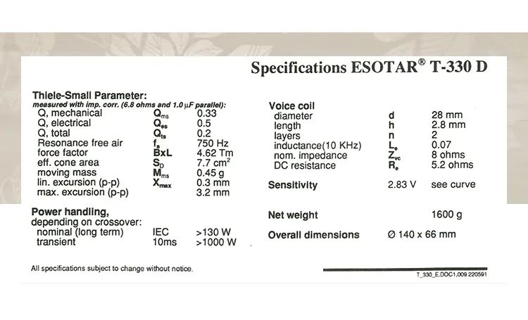 例如,一款售价 3,250 美元的某品牌高音单元标称瞬时功率150 瓦,长期可承受 55 瓦功率。再来看一下长期被认为是高音之王的丹拿 Esotar T-330 D高音的参数:瞬时承受功率(持续10毫秒时间)为惊人的 1000瓦,长期IEC承受功率大于等于130瓦。