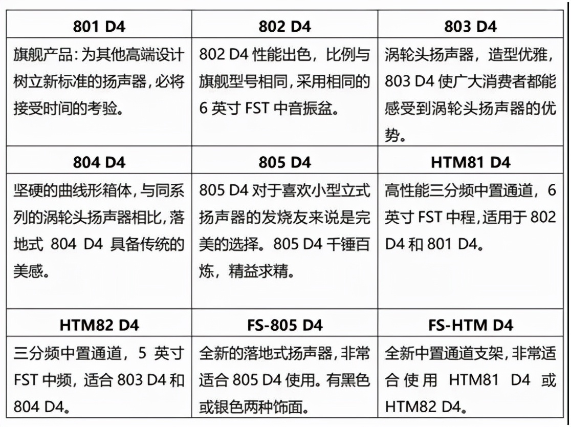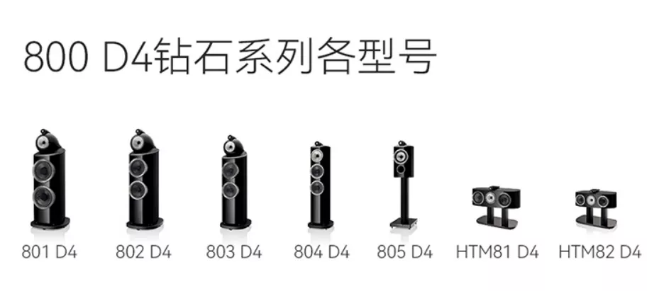 全新800钻石系列依然拥有7个型号:805 D4二分频落地式扬声器;804D4、803 D4和802 D4三分频落地式扬声器;Bowers & Wilkins隆重推出的旗舰产品801 D4,以取代旧款800 D3;以及两款高性能中置声道扬声器HTM81 D4和HTM82 D4,用于家庭影院配置。