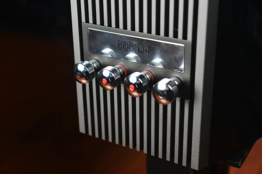 B&W805 D4箱体背部则是很厚重的铝合金材质整面包裹,同时音箱的分频器可以完美的安装到背部,可以有效的控制谐振问题。在背部则是四颗打磨的如同镜子一样的金属接线柱,上方则是印有805 D4的铭牌。与上一代不同的是,接线柱全部采用了Y插的结构,包装内的黑红两根线全部要用来做跳线连接。当有双功放需求的时候,还可以拔掉黑红线,用来当做双线分音,就可以实现双功放驱动了。