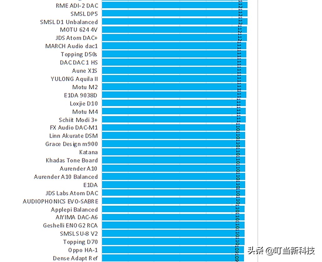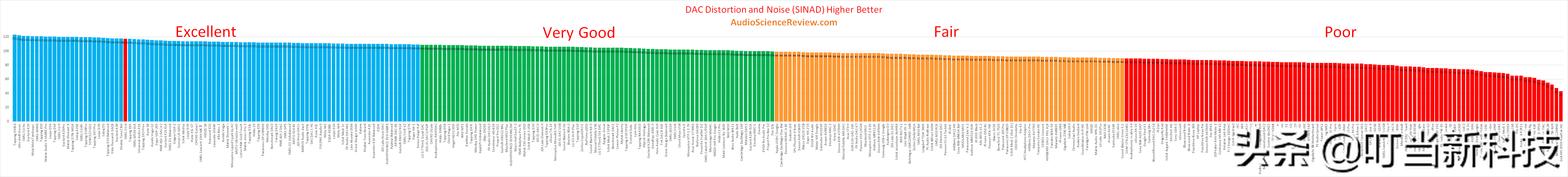 为了让你了解DAC的性能到底如何,请看一下图1,这是DAC的评级排名。SINAD(失真和噪声)是信号与噪声之比与失真相加。SINAD越高,噪声和失真量越低。图1中测试DAC SINAD数值,从令人难以置信的最差的55 dB,到最好的123,目前第一名为国产品牌广东托普TOPPING D90SE!  DAC SINAD排列1