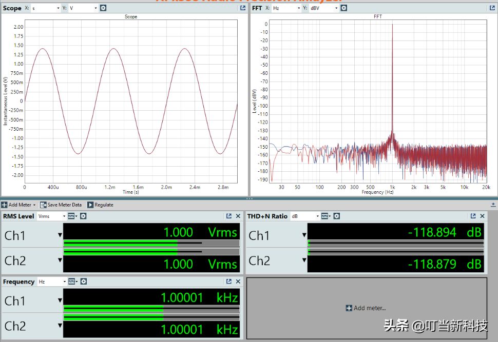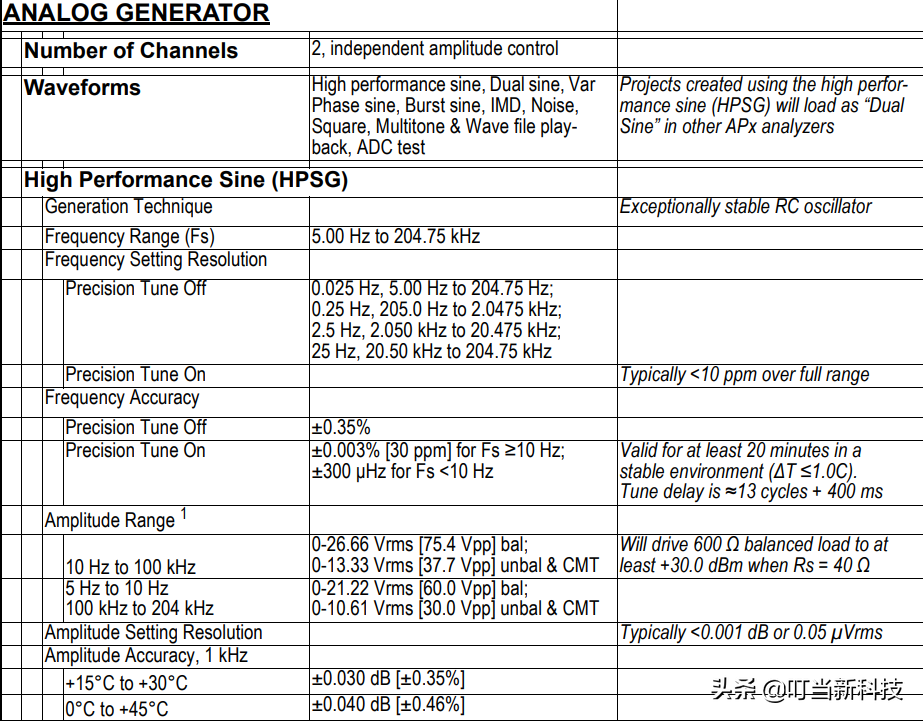 APx555的一些指标: 正弦频率范围:0.001 Hz 至 80 kHz,DAC;5 Hz 至 204 kHz,模拟; 平坦度 (5 Hz–20 千赫):±0.008 dB; esidual THD+N (22 kHz BW):–117 dB + 1.0 μV Typically <–120 dB (1 kHz, 2.0 V);