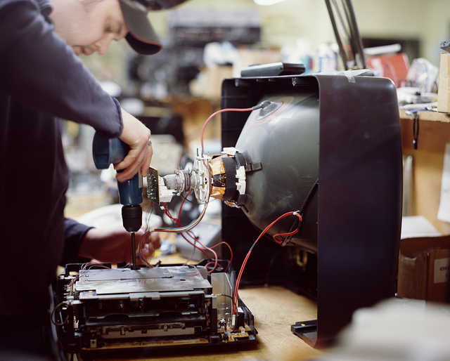 有了三原色像素后,由灯丝加热电子枪阴极,阴极发射电子,在加速极电场的作用下,经聚焦极聚成很细的电子束。再由阳极高压作用,获得巨大能量,以极高的速度去轰击荧光粉层。受到高速电子束激发,这些荧光粉单元分别发出强弱不同的红绿蓝三种光,根据空间混色法产生各种色彩。