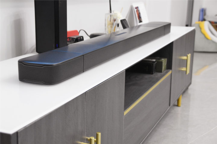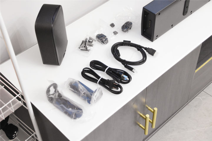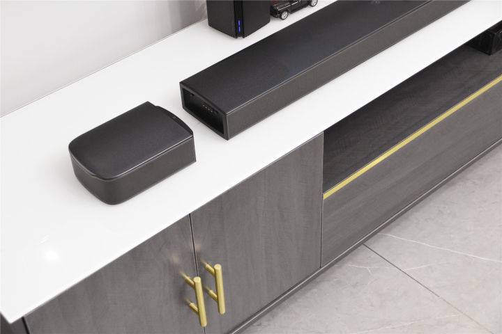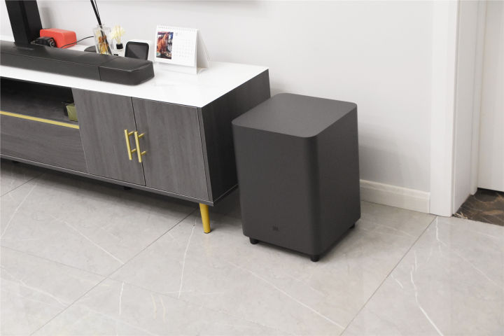 专业,为家庭打造顶级影院体验 我选择的这一套回音壁由低音炮和长条形音箱组成,长条音响尺寸为884mm,而低音炮的尺寸大小和我家的电视柜尺寸相当,正好摆在侧面,下方的图片就是我实拍的图片,这一整套科技感超强的回音壁套装与我家的装修还比较搭。