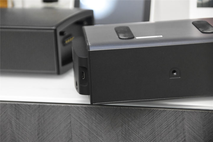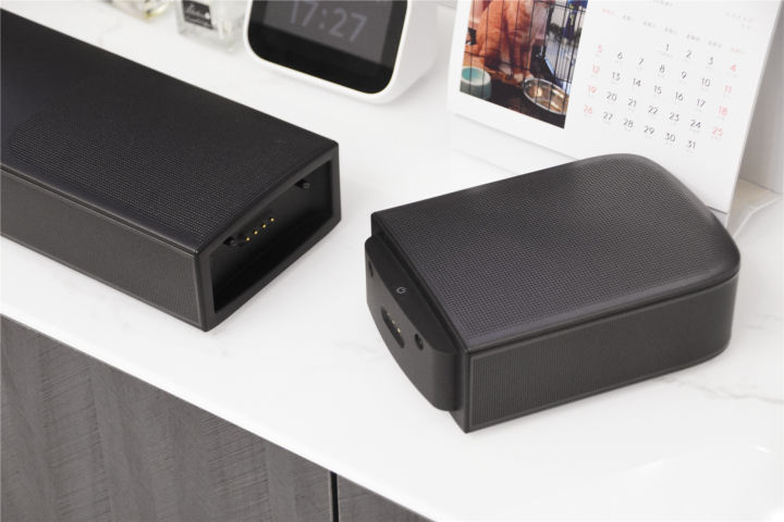 既然是无线就不得不提到充电,当长条音箱主机连接电源之后,两个磁吸无线扬声器吸在两端即可进行充电,充满电后会有指示灯提示。为了满足更长时间的使用,无线扬声器上也设置了开关以及充电接口,即使长时间没有连接到主机也一样可以工作,灵活性非常棒。