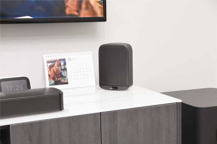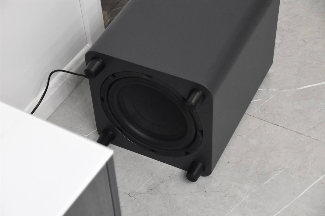 对于这个低音单元我们不需要复杂的连接,只要找到一个合适的地方把它放在那就可以了,它与主机之间会通过无线方式进行连接,我们剩下的就是计划把这个小胖墩放在哪里。