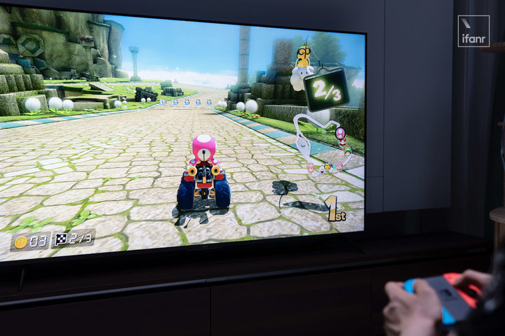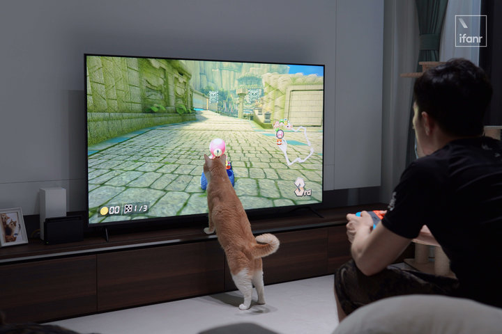 我也利用现有设备连 Switch 玩了两局马里奥赛车 8 豪华版,虽然只能输出的 60Hz 画面有点拉这台电视的高刷屏,但游戏的流畅、画面的亮度,以及猫猫的反应在我这里是满分的。