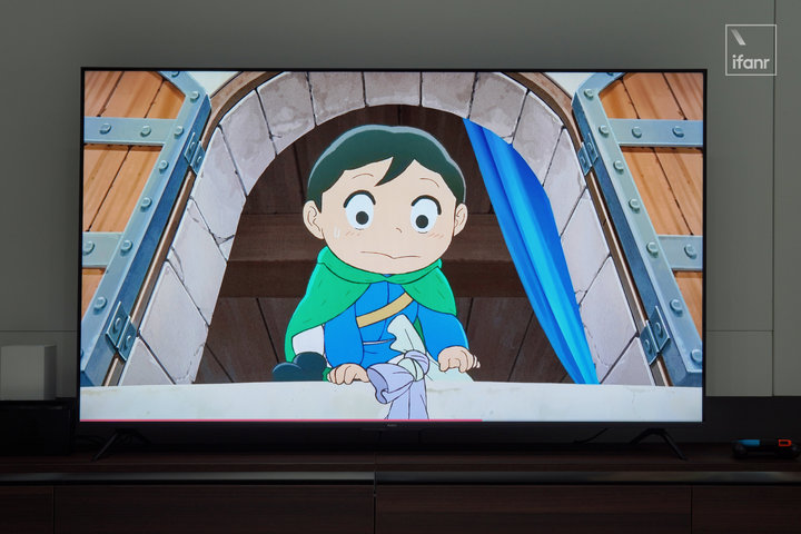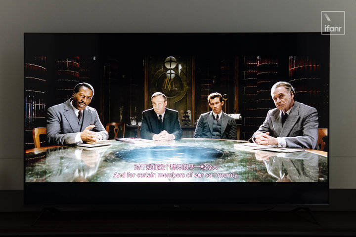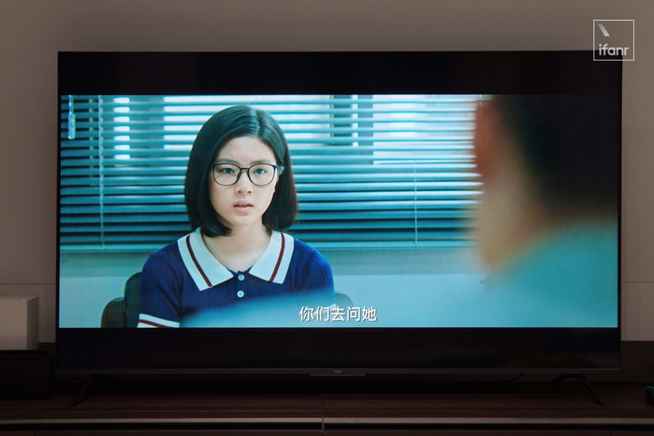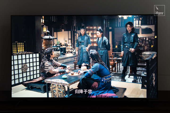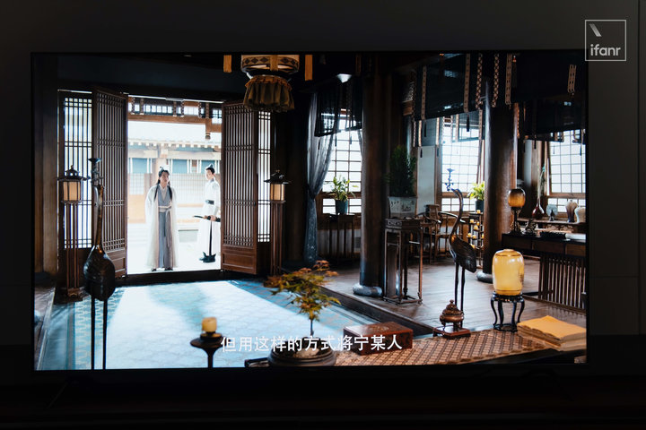 并没有克服的是,暗场画面中的细节在 Redmi 智能电视 X 2022 款上的表现依然一黑蔽之,这也是由于无分区的面板和亮度不足导致的硬伤。所以观看一些环境较暗的画面时,场景布置的细节也会被黑色遮蔽。