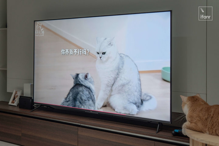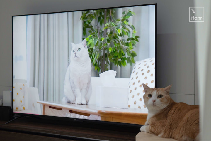另外支持杜比全景声,无论是看电影或是玩游戏,带来的沉浸感更足。在此多说一个体验杜比全景声时发生的小插曲,帮大家了解一二。每次看电视,我的猫对眼前会说话的黑盒子充满了好奇,每次想要摸清楚它到底从何发声时,猫猫站在电视柜前观察的方向不是只盯着下方扬声器的位置,而是上下左右观察一周,最后气急败坏只能挠屏以示愤怒。