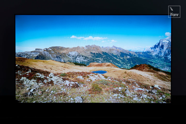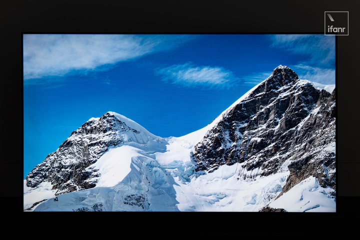 播放图片的话,电视会利用 AI 算法对画面细节进行优化。从 Sony 直出的两张风景照中,优化后的高山湖泊与天空更有通透感,而山峰和高山草甸的黄与绿色才绚练,线条棱角显得比较锐。肉眼感知下,亮度提升更明显的是第二张图:白色面积较大的画面。雪山山脊上的阴阳两面、裸露岩石与雪之间的对比非常清晰。