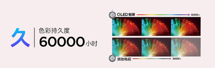 而QLED电视采用了无机量子点显示材料,稳定性大大优于采用了有机材料的OLED电视,QLED电视使用寿命可达60000小时,OLED电视一般只能达到30000小时。