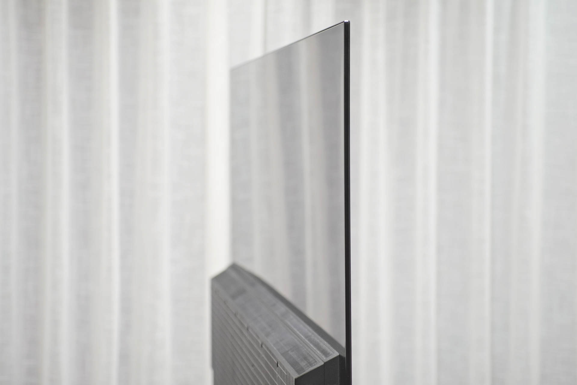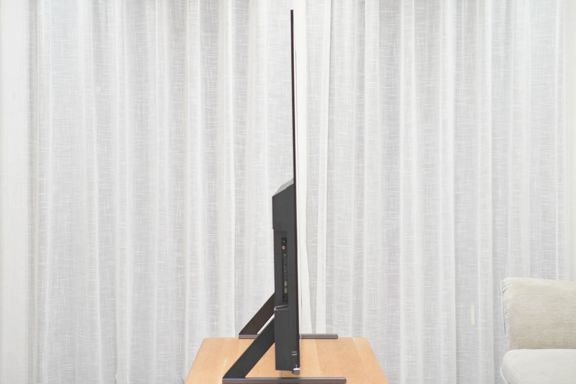 其实从侧面这个角度来看,东芝火箭炮X8900KF的上半部分是非常薄的,下半部分也并没有比市面上其他平板电视更厚,而在如此轻薄的机身中,却依然被容纳了一套听感极好的音响系统。
